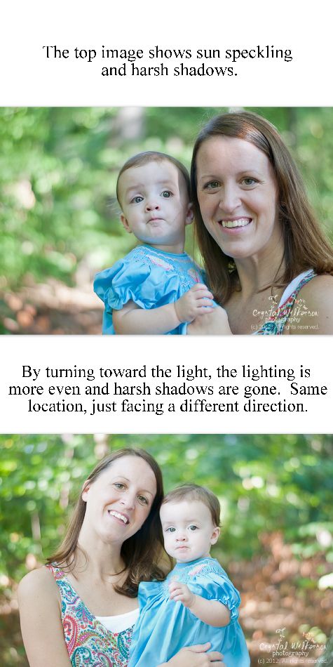 In the first photo, the faces are not facing the light source and are under dappled light, and you can see the resulting shadows and light/dark spots on the faces. However, by turning the subjects faces about 45 degrees directly toward the light source, and by having mom step out of the dappled light, the shadows and light/dark spots vanish and a nice even lighting is achieved.