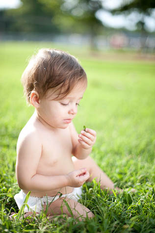 1. A few things to keep in mind before you start: time of day matters! You want to capture your baby when she is happiest, and for most babies that will be in the morning. Early morning light also looks great in photos. Make sure tummies are full and the photo session will be easier on everyone. In choosing your location, make sure there is plenty of soft light and keep background distractions to a minimum. Check out the difference in the photos below - all I did was move baby girl to that patch of shade you can see at the bottom of the photo, and move my vantage point around her and shoot slightly above. This created softer, more even light, and the focus is on her, not the playground and other distractions in the background.