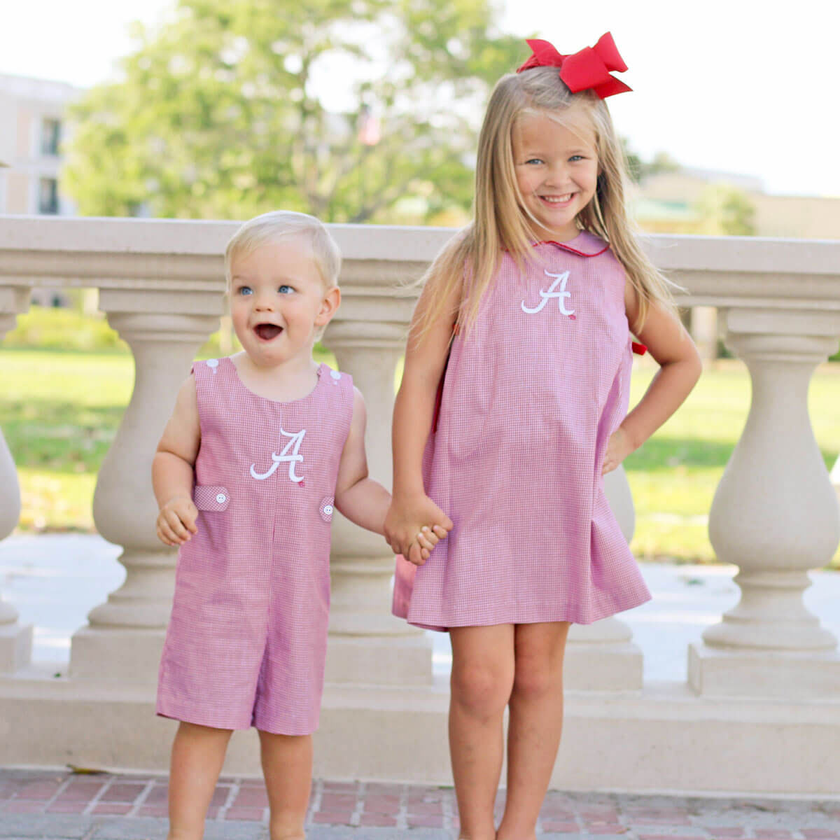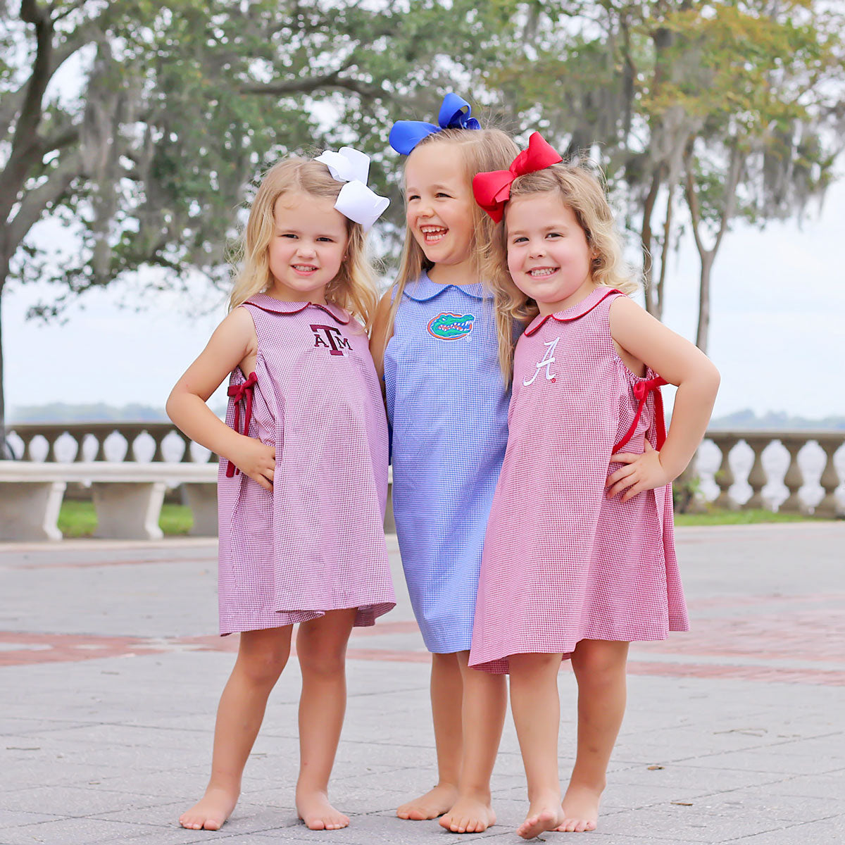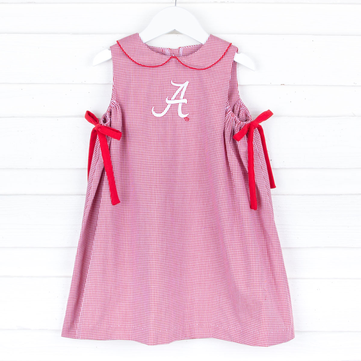 Roll Tide! Your little one will look adorable this football season in our Alabama Embroidered Red Gingham Dress. This sleeveless red gingham dress features a collar, Alabama embroidered logo and side-tie bows. Add a name monogram!