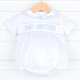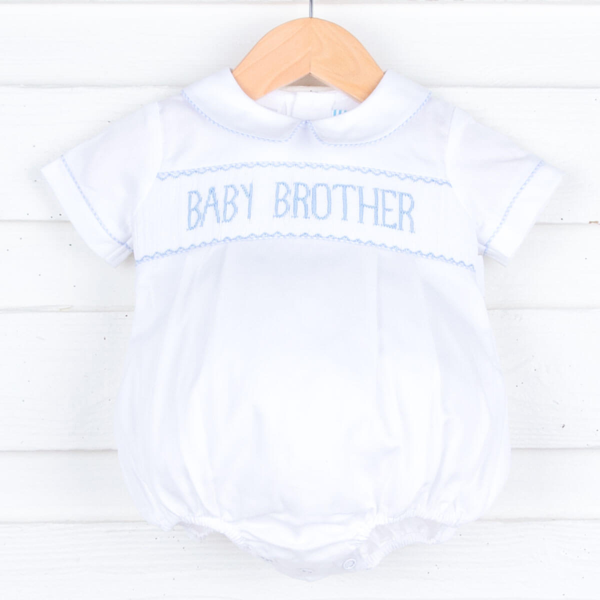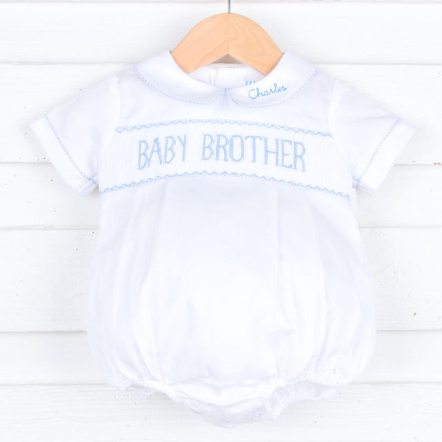 Welcome a new baby brother! This sweet collared bubble in solid white features blue "Baby Brother" smocking and blue trim. Back buttons and snaps in stride. Darling for those first look sibling photos.