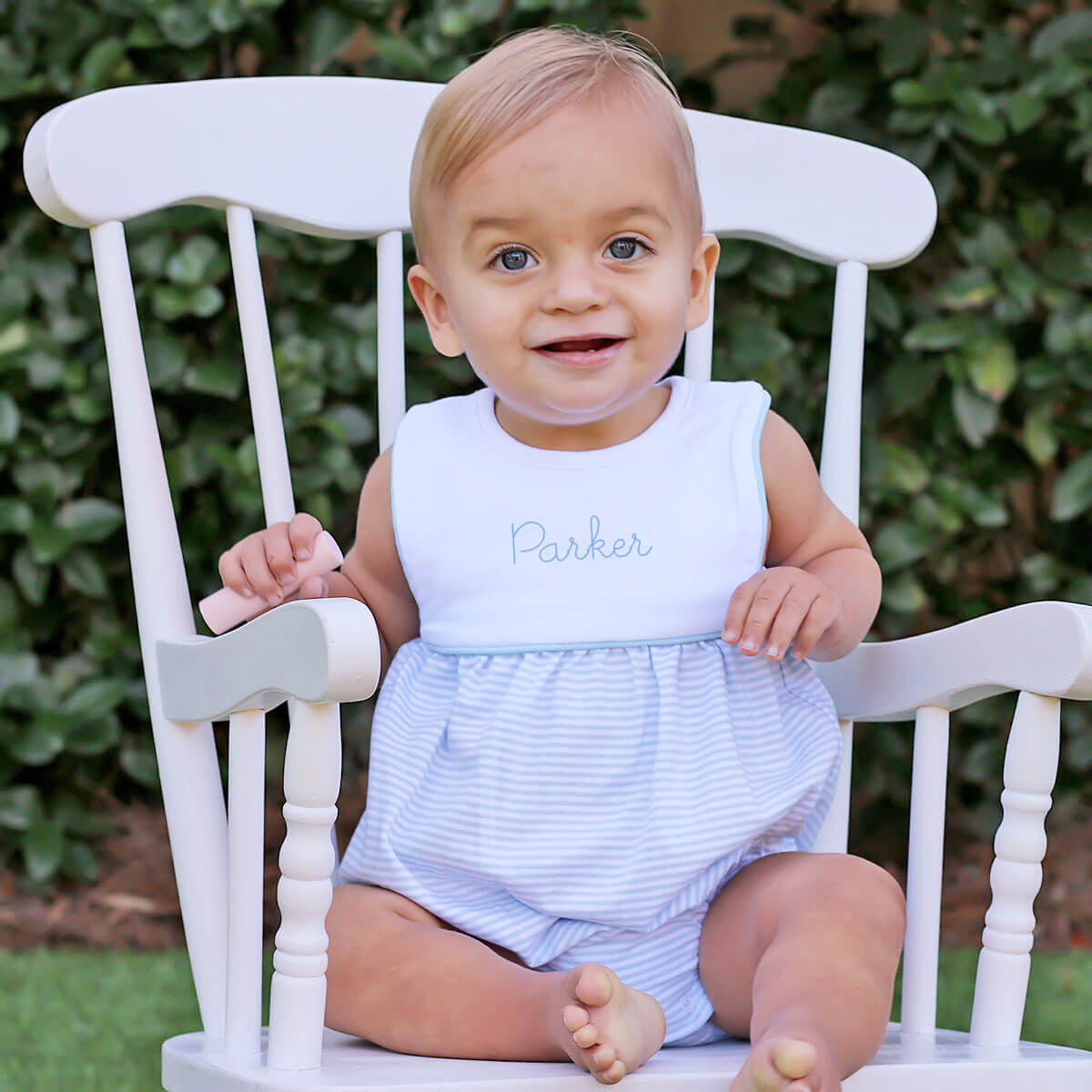 This Blue Stripe Boy Bib Bubble is the perfect outfit for all seasons! Crafted from a charming blue stripe knit with a stylish white bib detail, it's both comfortable and adorable. The bubble design ensures easy wear with snaps in stride. Personalize the look with a monogram for that extra special touch.