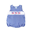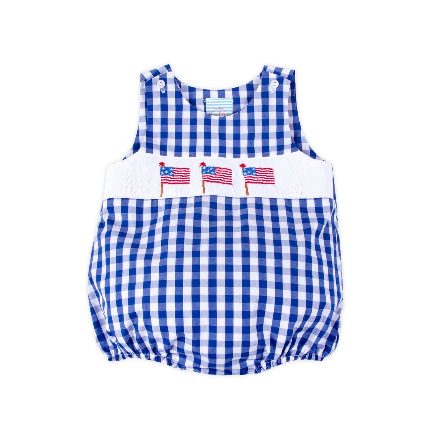 This Flag Smocked Royal Check Sun Bubble is the perfect outfit for watching fireworks and celebrating a 4th of July cookout! Made from royal blue check fabric, it features charming flag smocking. Shoulder buttons and snaps in stride for easy changes.