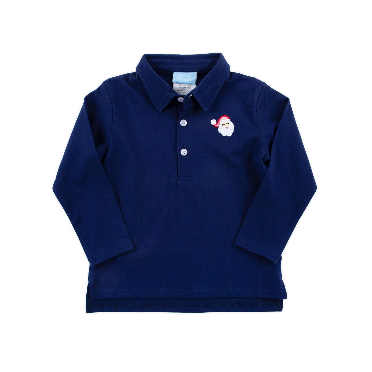 This Happy Santa Navy Long Sleeve Polo is perfect for pictures with Santa or unwrapping Christmas presents! The blue polo features a charming Santa applique on the side. Ideal for holiday parties, playtime fun, comfort, and cuteness! Don’t forget to add a monogram for a personalized touch!
