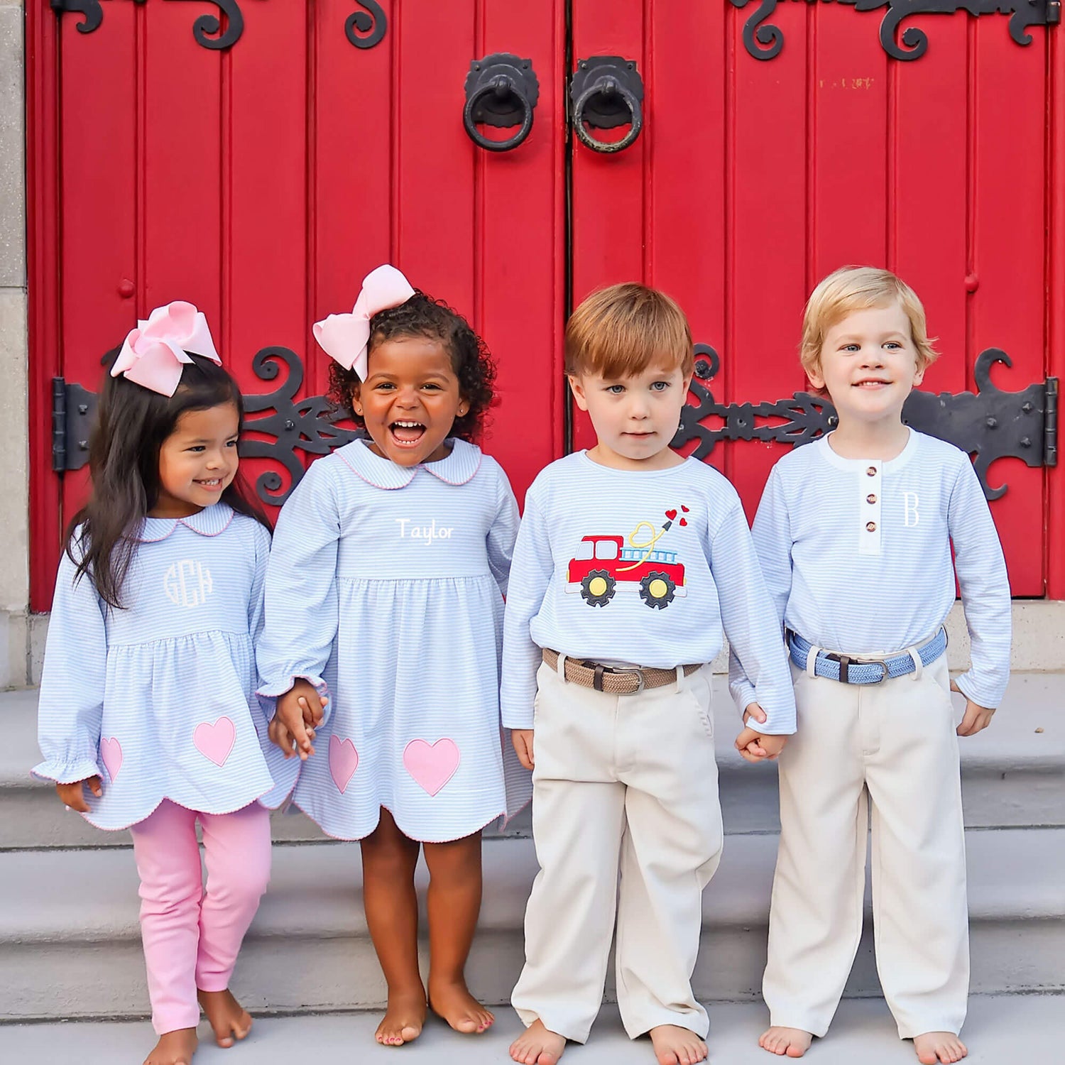 Your little guy will look adorable in our Heart Firetruck Light Blue Stripe Long Sleeve Shirt. This light blue striped knit shirt features an appliqué of a firetruck sprinkling hearts. Perfect for classroom celebrations, Valentine’s Day parties, or a sweet photo moment