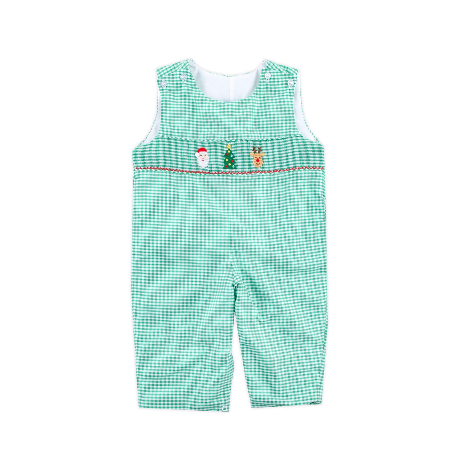 Prepare your little one for the holiday season with this Jolly Christmas Smocked Green Windowpane Longall. This green windowpane longall features a smocked Santa, Christmas tree, and reindeer with snaps in stride for easy changing.