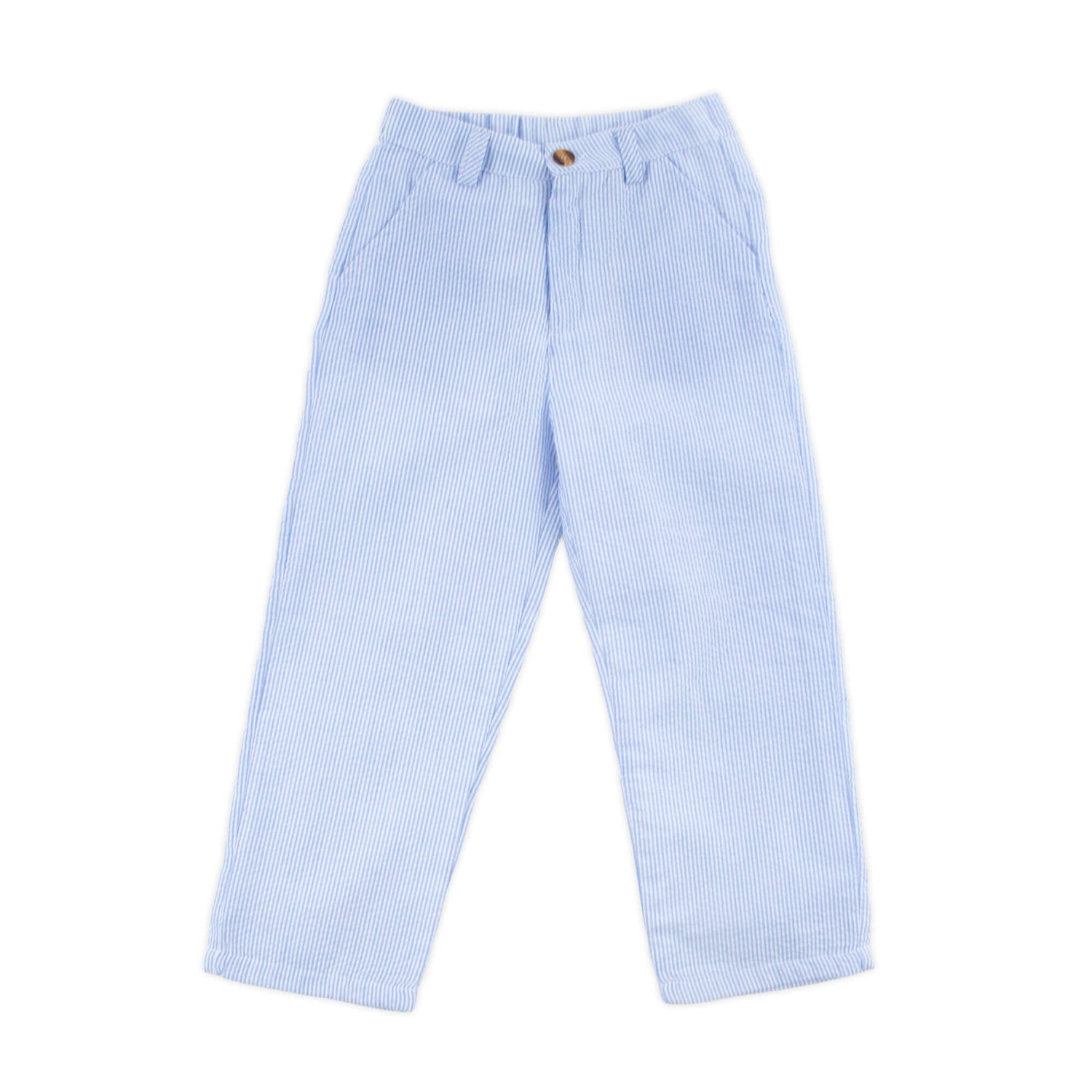 This Light Blue Stripe Standard Pants are a classic addition to your big boy's wardrobe for year-round wear. Versatile and stylish, they can be paired with your favorite button-down or polo shirt for a timeless look. The classic straight silhouette features slant pockets, back welt pockets, a zip fly with button closure, and belt loops. These pants are perfect for school, church, play, or a collegiate look.