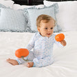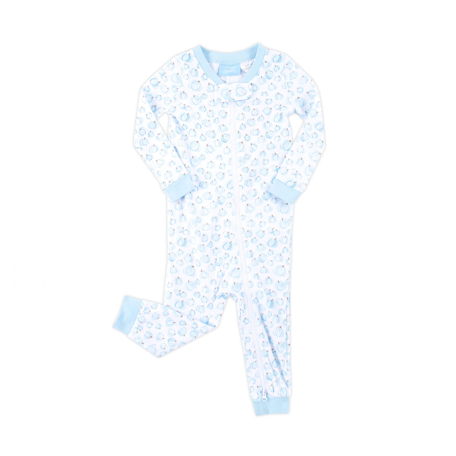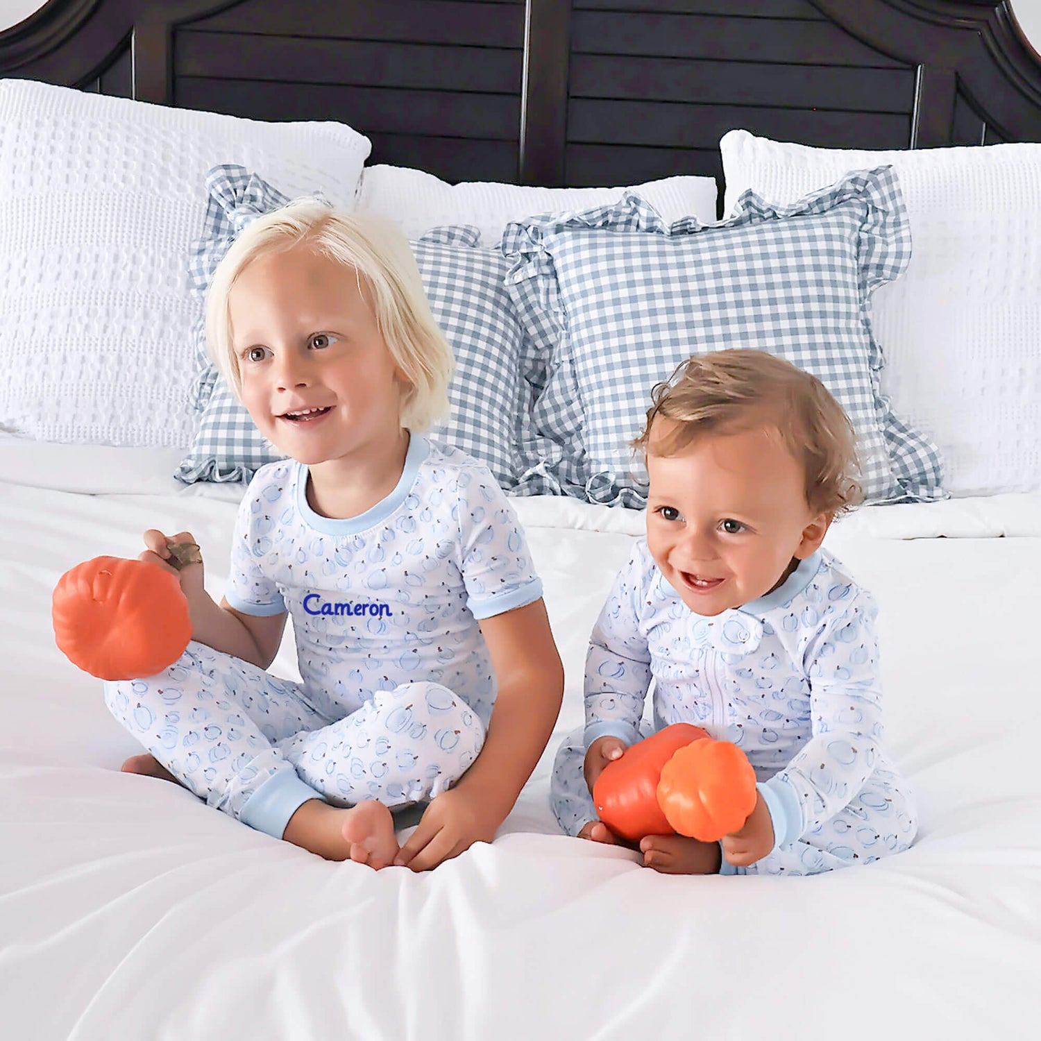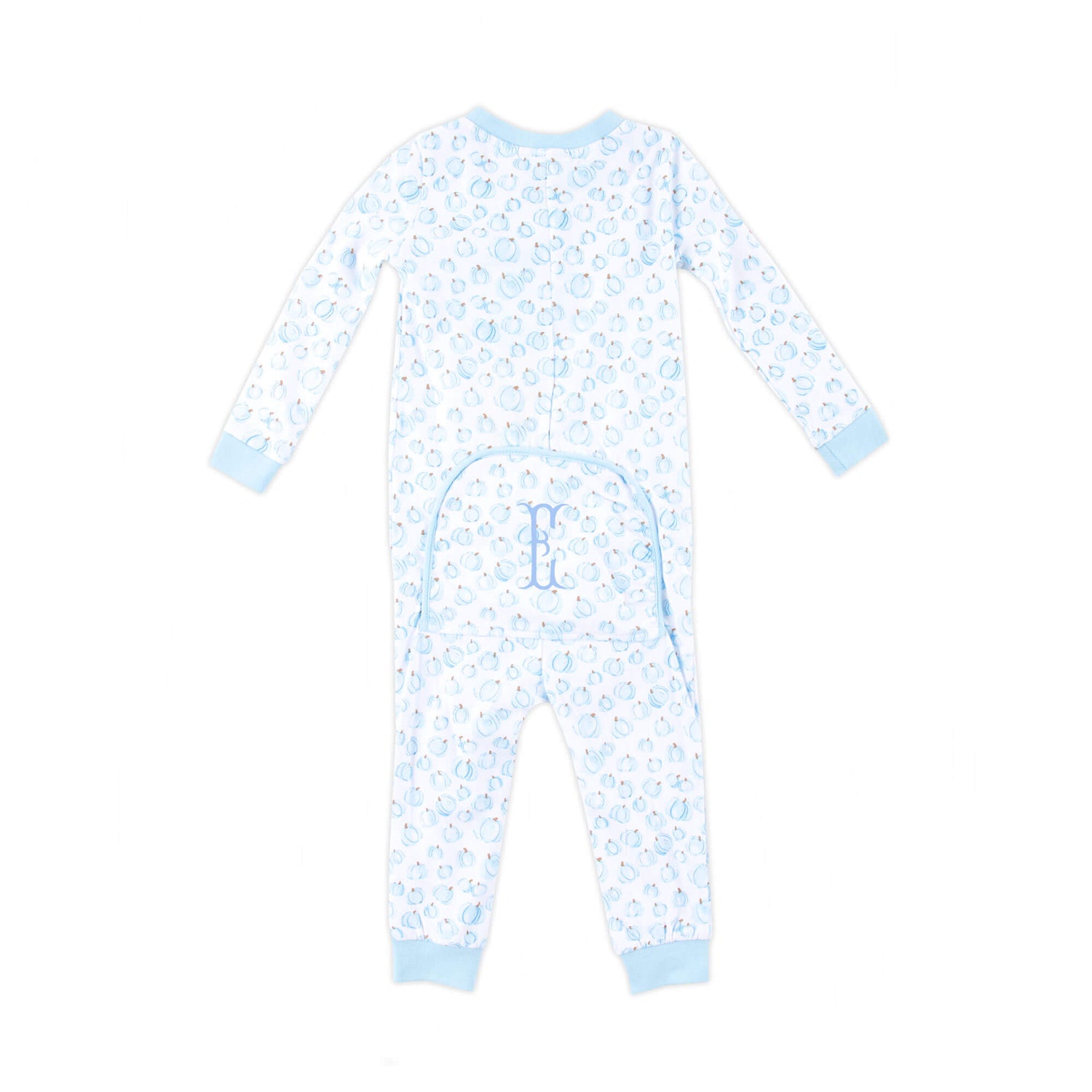 Find your cozy Fall look with our Little Pumpkin Patch Blue Zip Sleeper. Made from a soft knit, these pajamas feature a custom blue pumpkin print with blue trim. This zip sleeper makes nighttime changes a breeze and provides the perfect combination of comfort and warmth. Personalize these pajamas with a monogram for a unique touch!