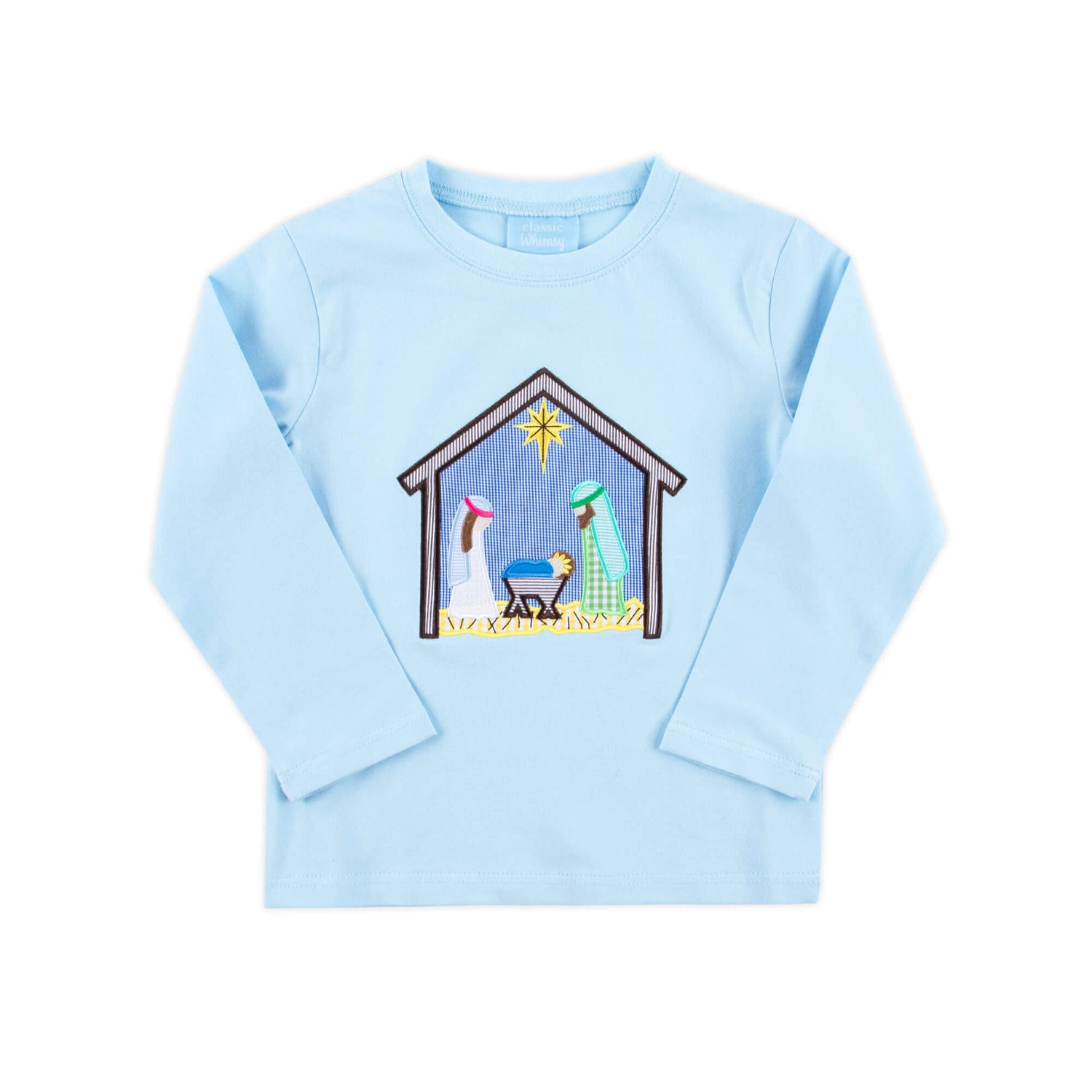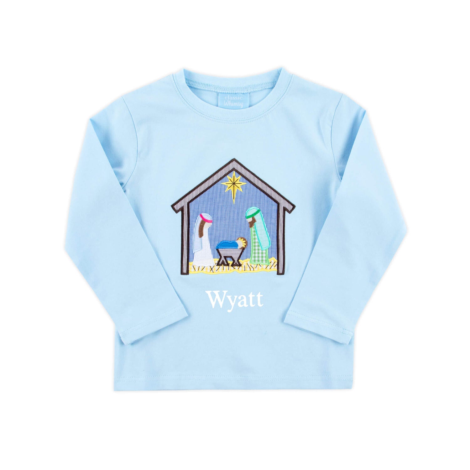 Celebrate the miraculous birth of Jesus with this Nativity Light Blue Long Sleeve Shirt! This classic light blue shirt features an adorable applique of a Nativity scene. Add a monogram to personalize the shirt and make it uniquely yours!