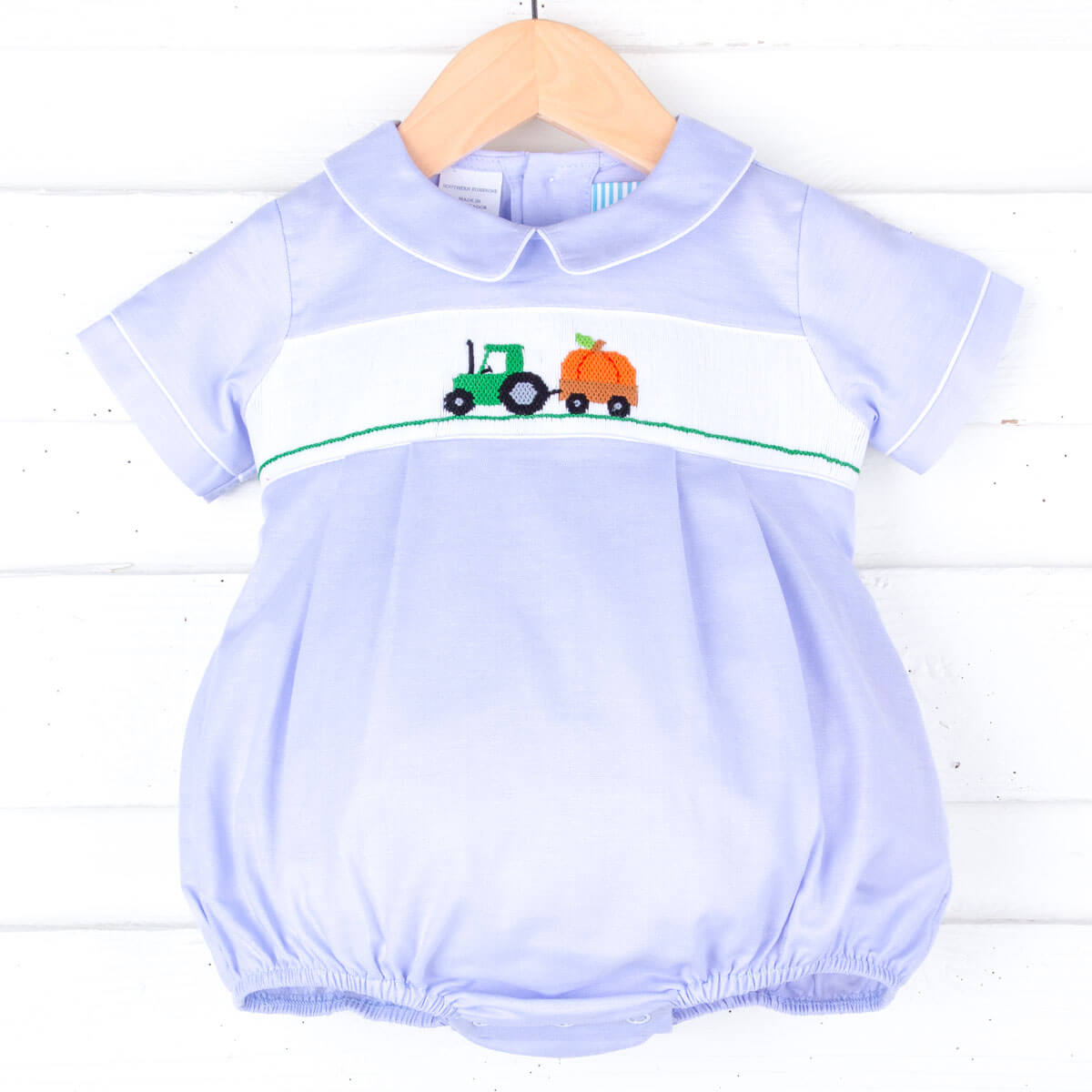 Your little one will look adorable in this Pumpkin Delight Smocked Blue Collared Bubble, perfect for the pumpkin patch. This sweet oxford blue bubble features a smocked green tractor and a pumpkin, adding a delightful touch to this outfit. It is designed with a collar, short sleeves, and snaps in stride for easy changes.