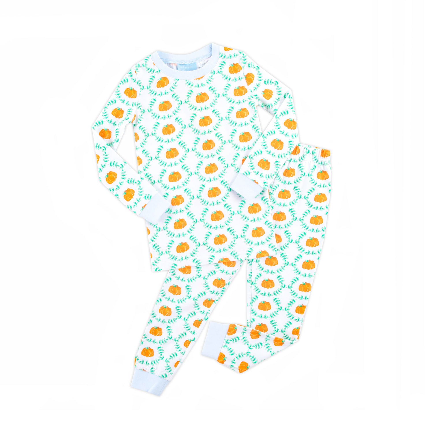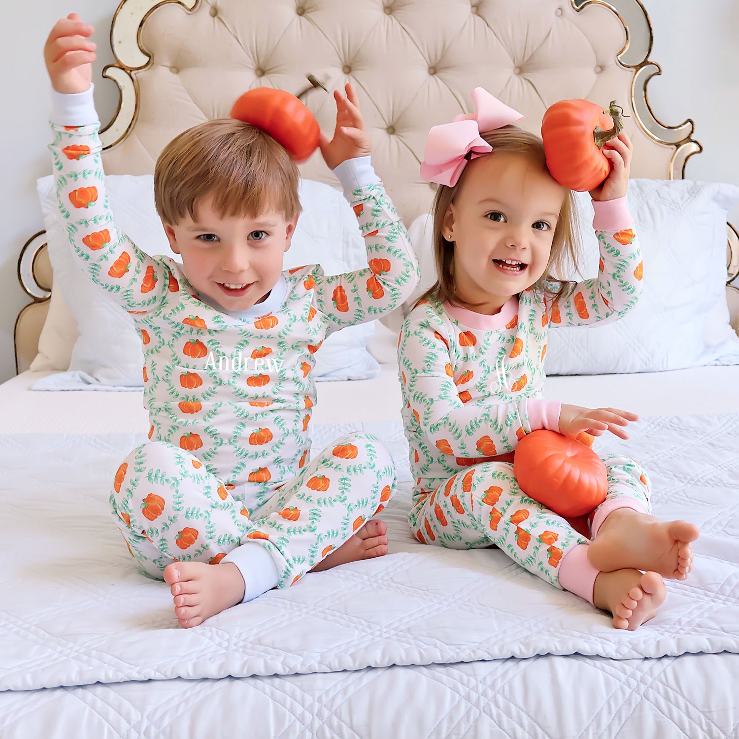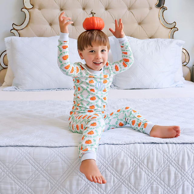 Your little one will be dreaming of the Pumpkin Patch in our Pumpkin Splendor Blue Rib Pajamas. Made from a soft knit, these pajamas feature a custom pumpkin vine print with blue trim. The set includes matching pajama bottoms. Personalize these pajamas with a monogram for a unique touch!
