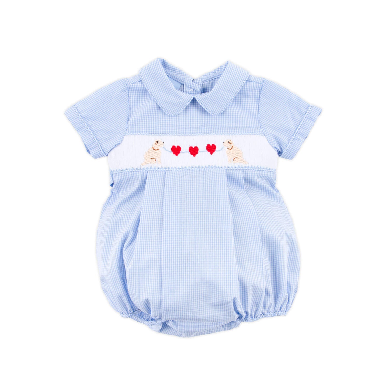Puppy Heart Smocked Light Blue Gingham Collared Bubble