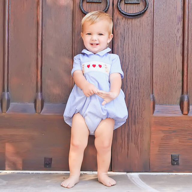 Get your little one ready for Valentine’s Day with our Puppy Heart Smocked Light Blue Gingham Collared Bubble! This charming bubble in light blue gingham features hand-smocked dogs with hearts, creating a delightful look. With snaps along the stride for easy changes. Add a monogram to the collar to make it more special!