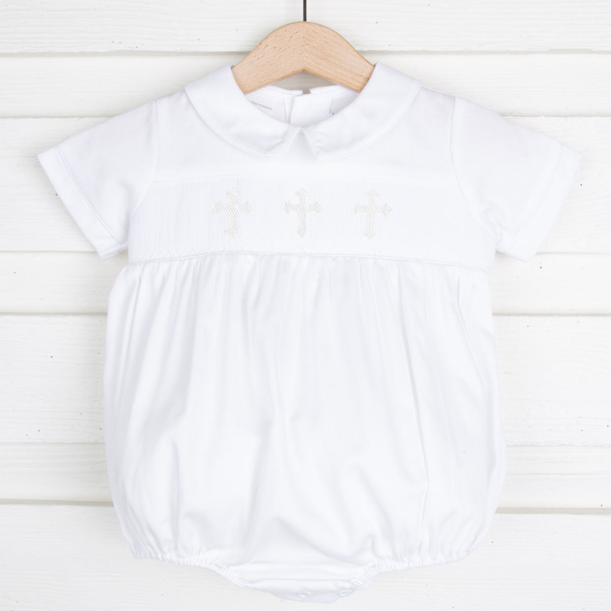 A classic white bubble for a special occasion like baby's baptism or other church events. The bubble features hand-smocked white crosses on a solid white pique fabric. Peter Pan collar. Buttons in back. Snaps in stride.