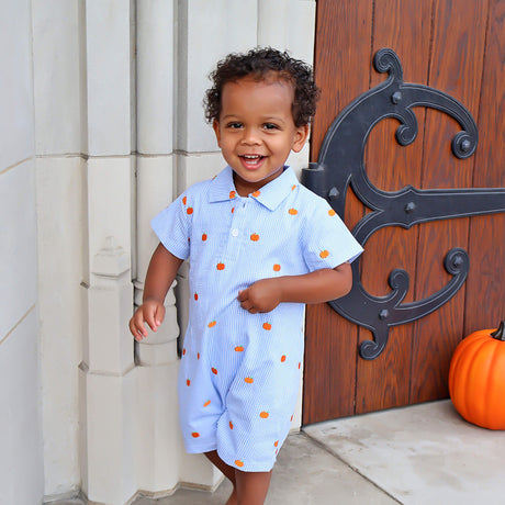 Pumpkin Schiffli Light Blue Gingham Polo Romper