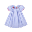 Start the school year in style with our charming ABC Smocked Blue Windowpane Bishop Dress! Designed in a classic blue windowpane, this sweet dress features adorable smocked 'ABC' lettering and a school bus, along with precious bishop-style sleeves.