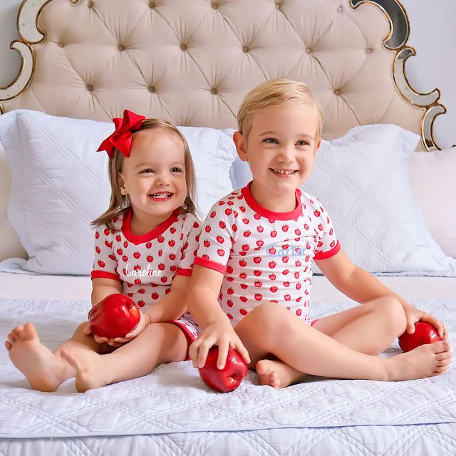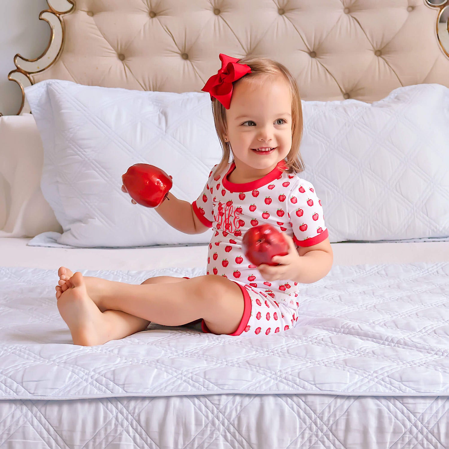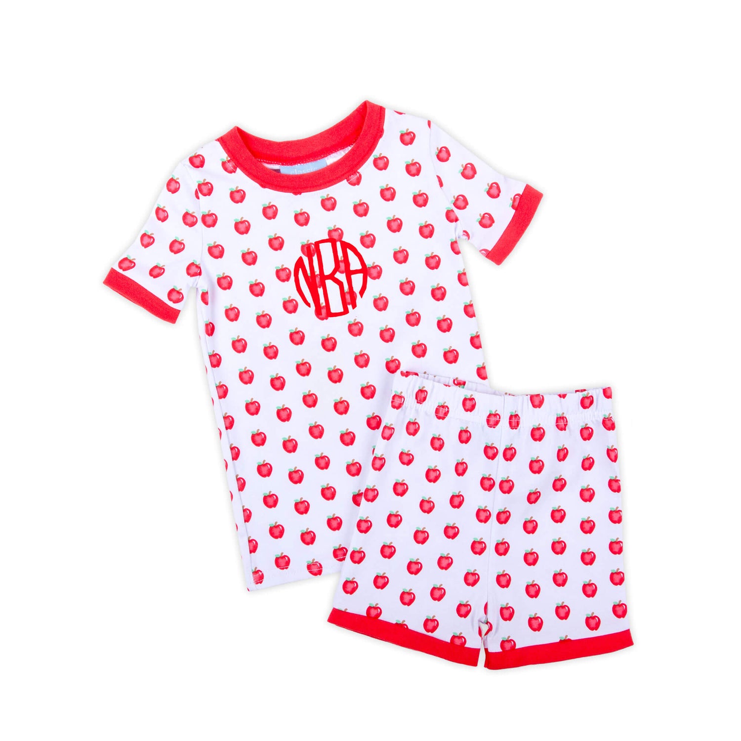 Get ready for back to school in our adorable Apple a Day Short Pajamas! Featuring the cutest apple print, this soft knit set includes a short-sleeve pajama top and matching shorts. Snuggle-ready and perfect for school nights, personalized with a monogram for an extra special touch!