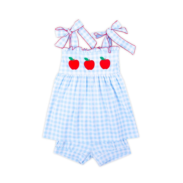 This sweet Apple Trio Light Blue Gingham Aurora Short Set is perfect for school days! The soft knit light blue gingham top features the sweetest apple appliqués and adorable tie straps, coordinated with matching soft knit light blue gingham shorts, making it a charming choice for back-to-school fun.