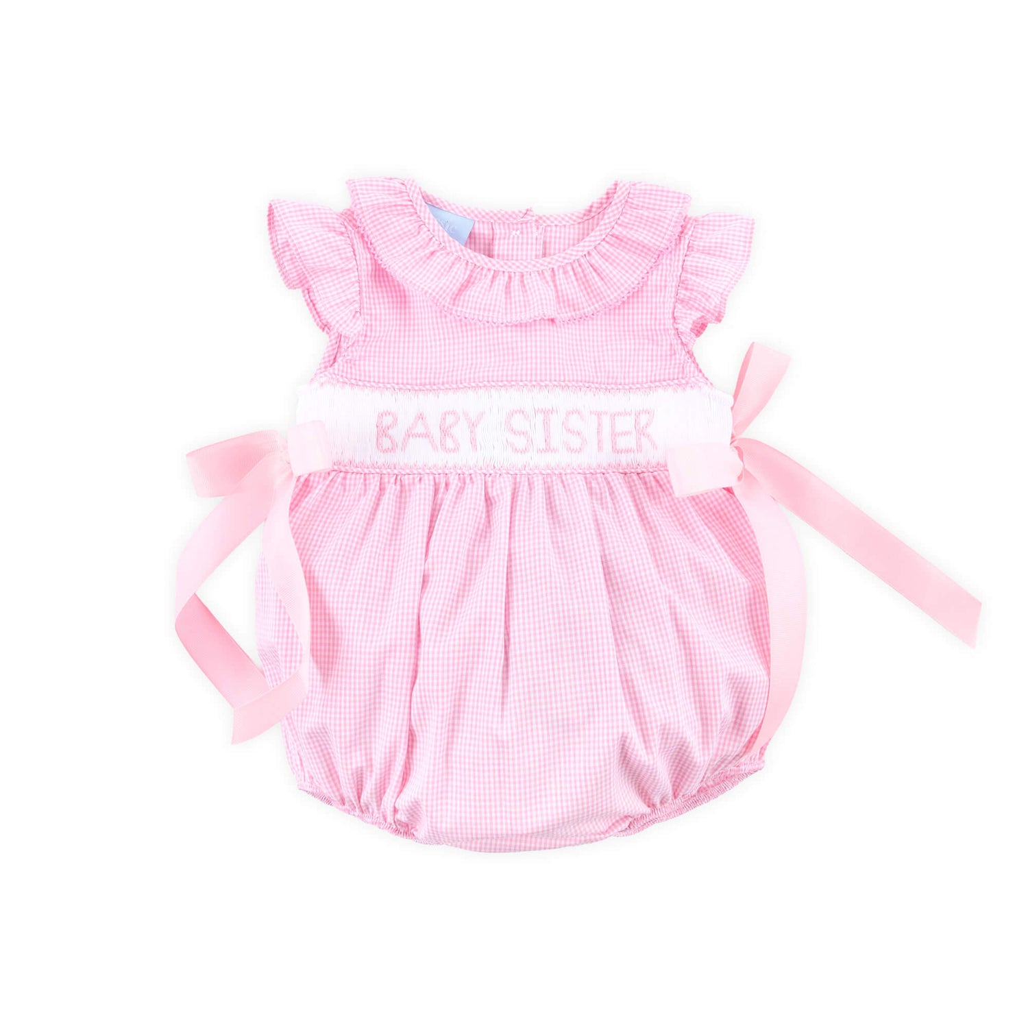 Celebrate the arrival of a baby girl with this "BABY SISTER" smocked bubble! Cute ribbon details, hand smocking, and light pink gingham complete the look. Snaps in stride.