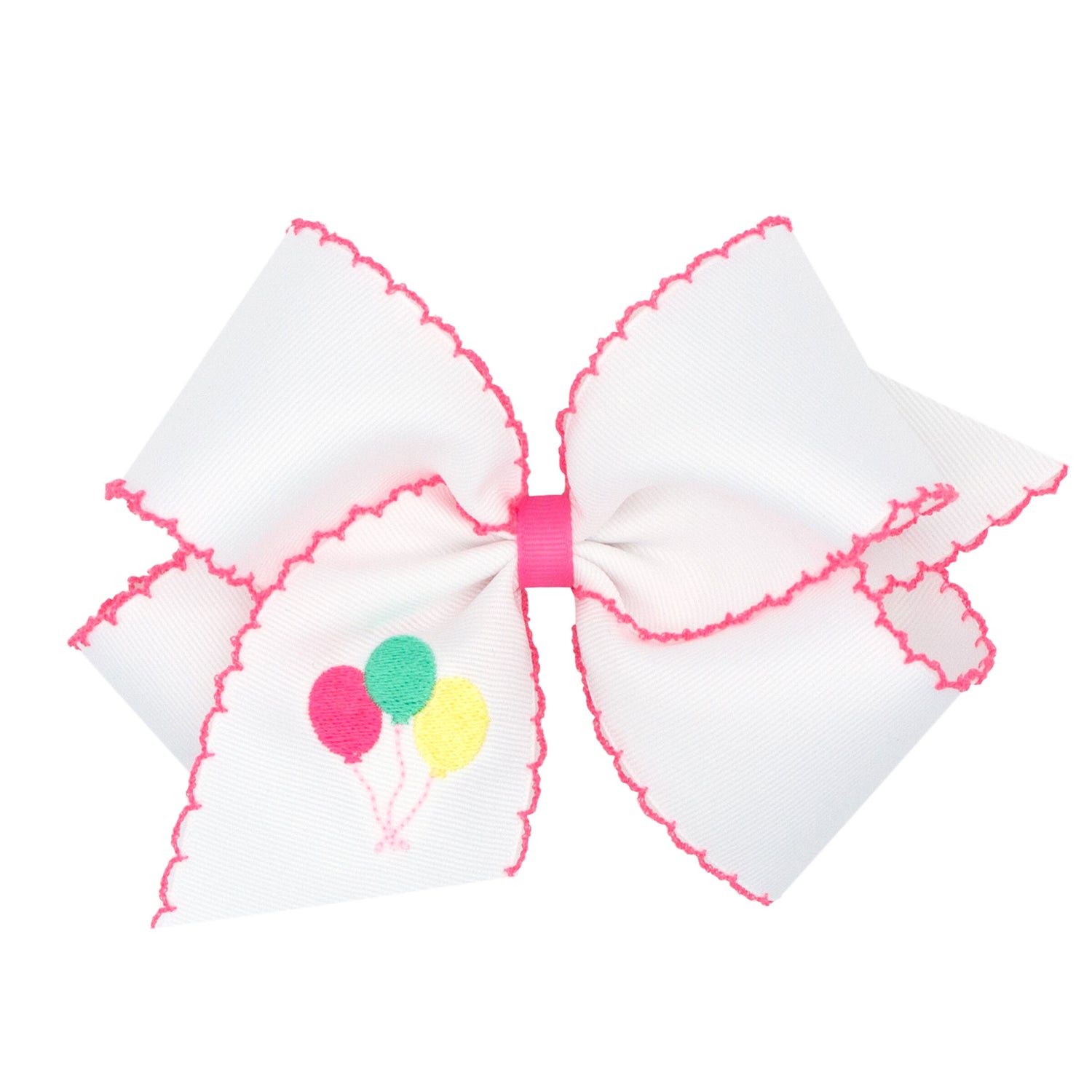Pastel color embroidered birthday balloons on a white grosgrain bow and coordinating pink moonstitch detail. Perfect for your little girl's celebration!