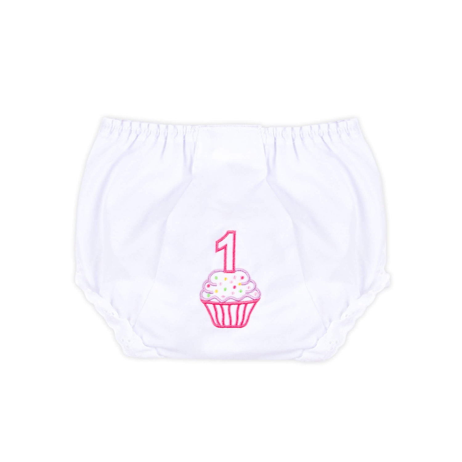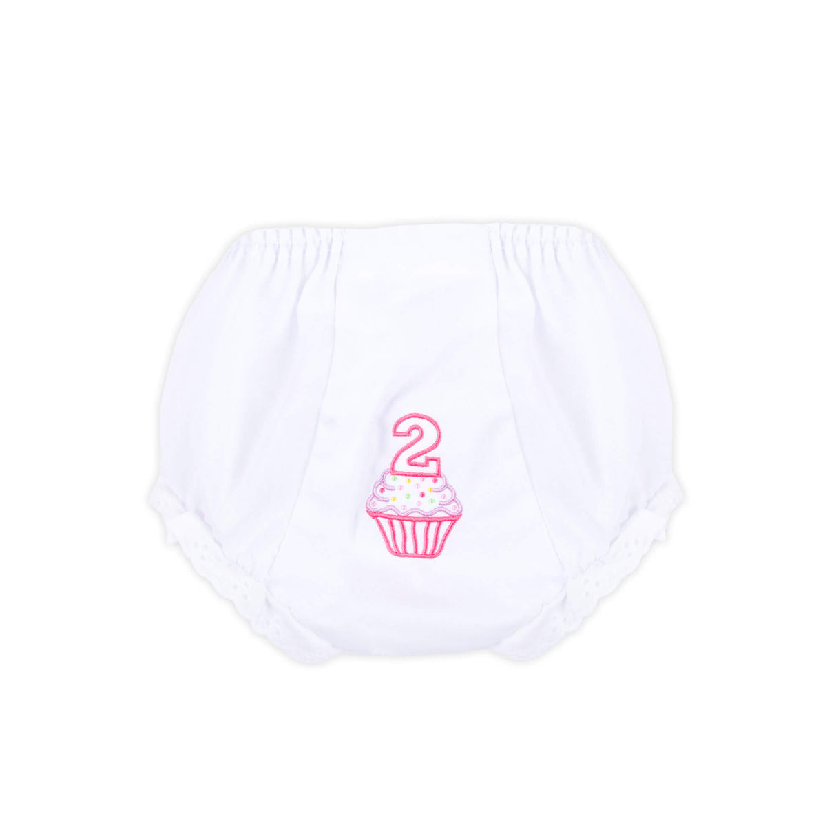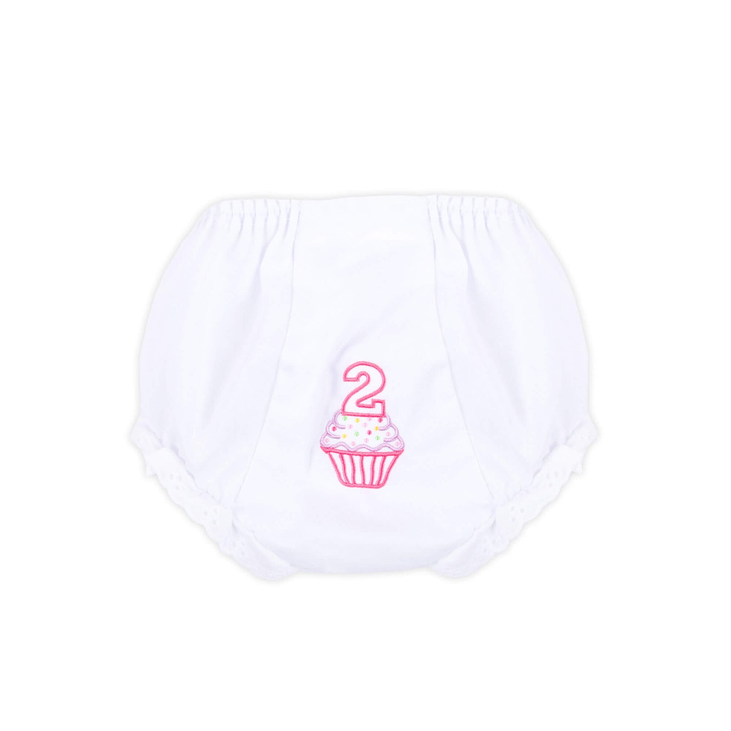 Make your little one’s birthday extra special with these Birthday Cupcake White Bloomers! Featuring an adorable embroidered cupcake and the number "1" or :2" with sweet eyelet trim, they’re the perfect match for any birthday outfit. Sizes 12M-24M are baby girl diaper covers, while size 2T are big girl panties. Perfect for celebrating in style!