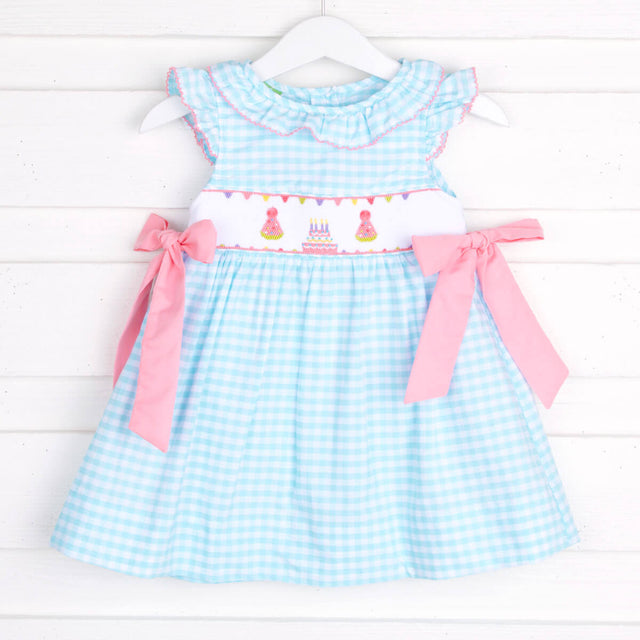 Your outfit is all set for a delightful birthday party with our Birthday Party Smocked Aqua Beverly Dress! This charming aqua check dress features sweet smocked birthday cakes and party hats, adding a playful touch to the celebration. Complete with an adorable ruffle collar and side-tie bows, it's perfect for your little one's special day.
