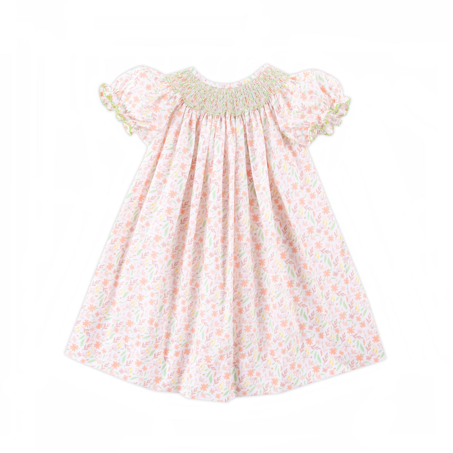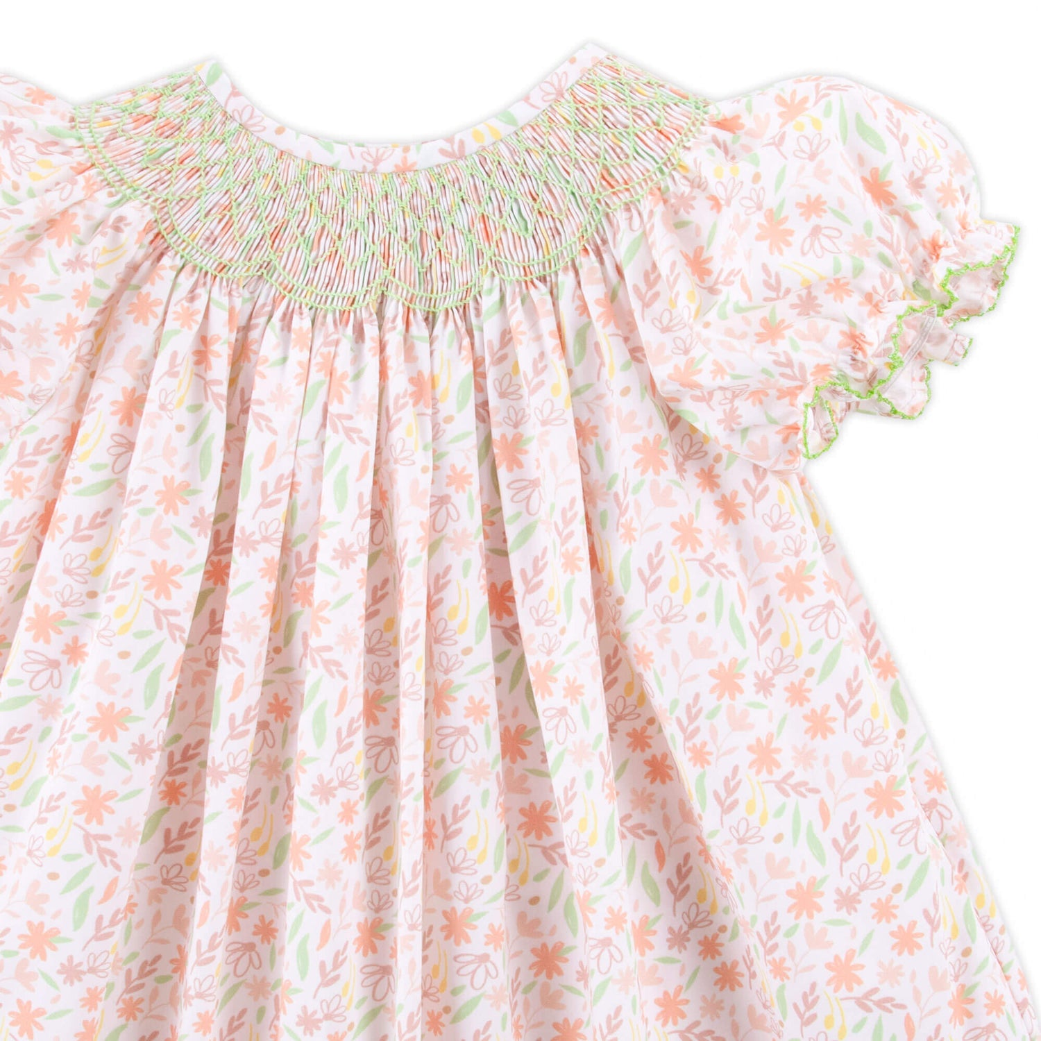 Your little one will be ready for all the autumn adventures in this Fall Leaf Floral Smocked Bishop Dress! Featuring a charming leaf print, delicate geometric smocking, and sweet bishop-style sleeves with playful green ric-rac trim, this dress is as delightful as a crisp fall day. Perfect for pumpkin patch visits, family gatherings, and all the cozy moments in between!