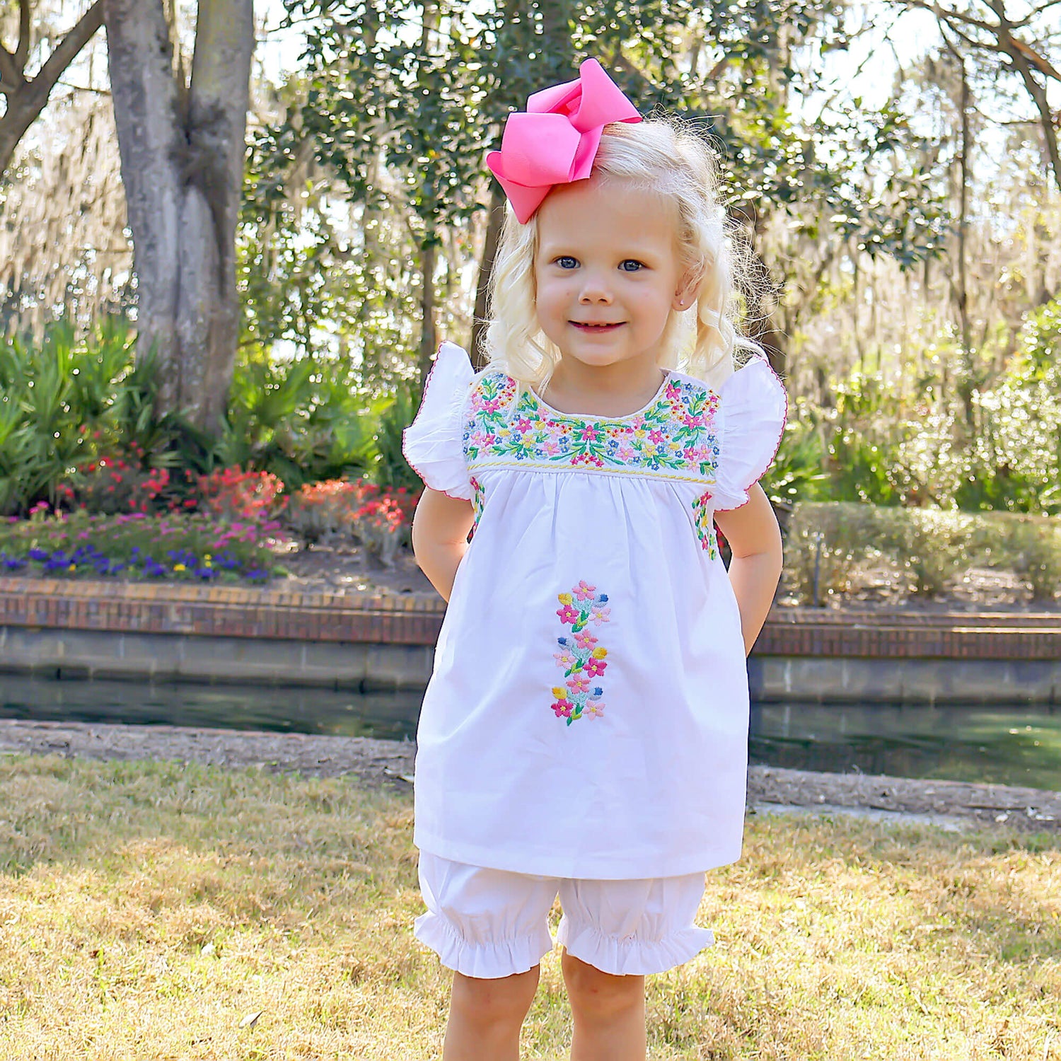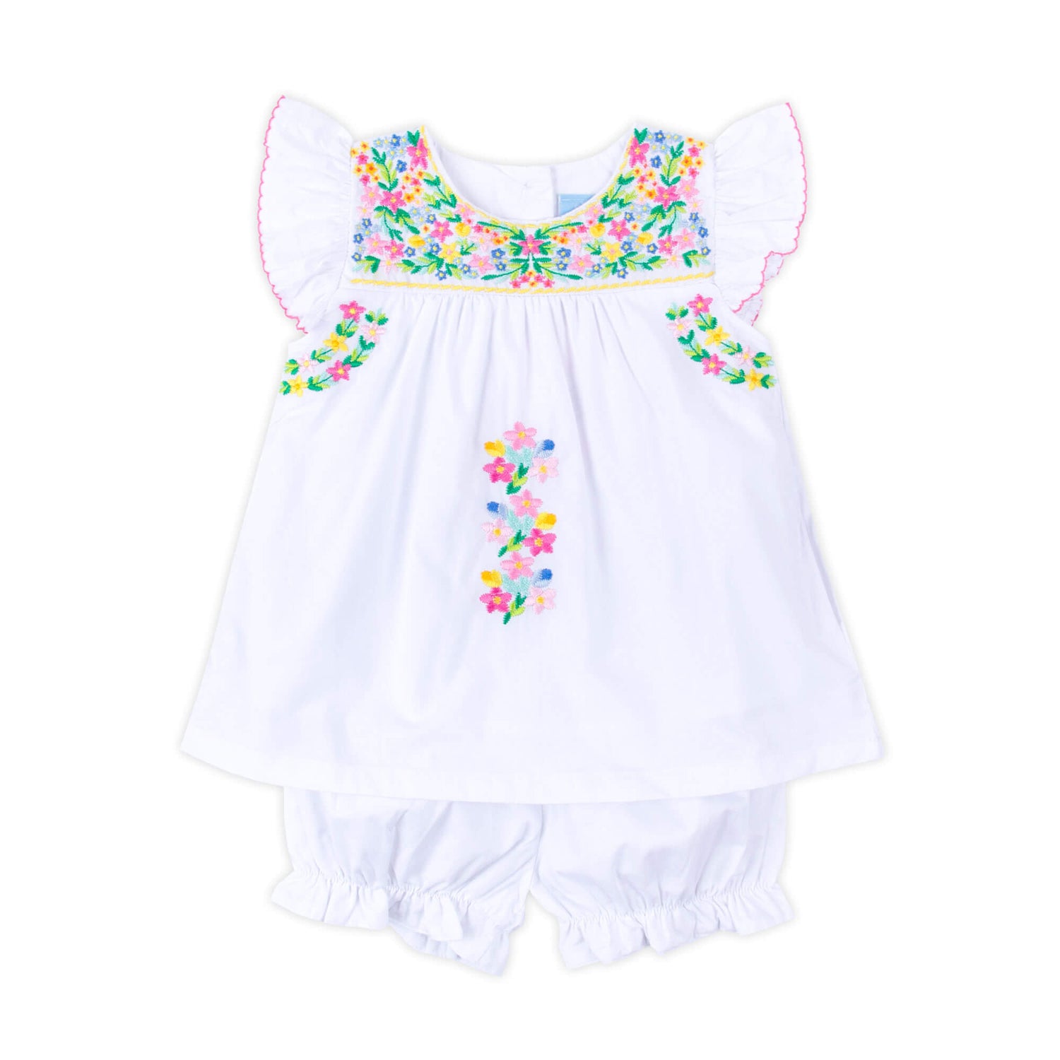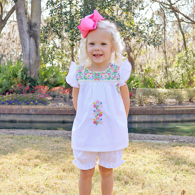 Match with mom in this adorable Fiesta Colorful Embroidered Bloomer set, the perfect summer outfit to celebrate your Cinco de Mayo fiesta. This white bloomer set features beautiful embroidered flowers for a traditional fiesta look, along with flutter sleeves adorned with pink picot trim, making it ideal for your next celebration! Paired with matching bloomers. Easily coordinate with mom and siblings by selecting from the Fiesta Colorful collection.