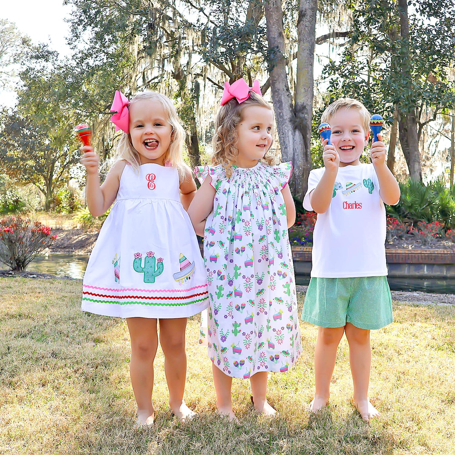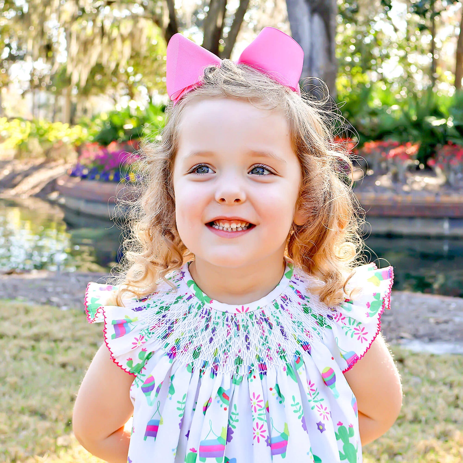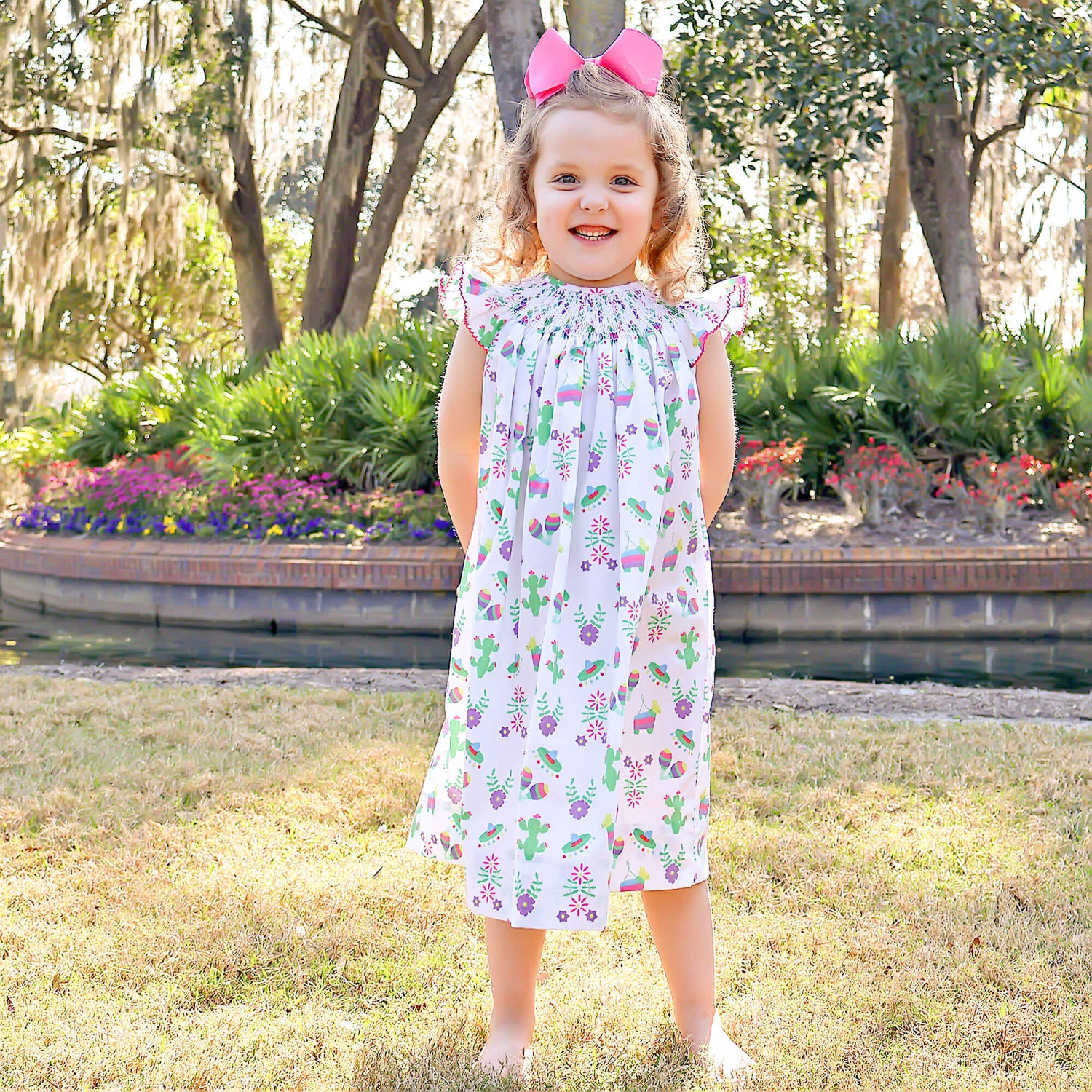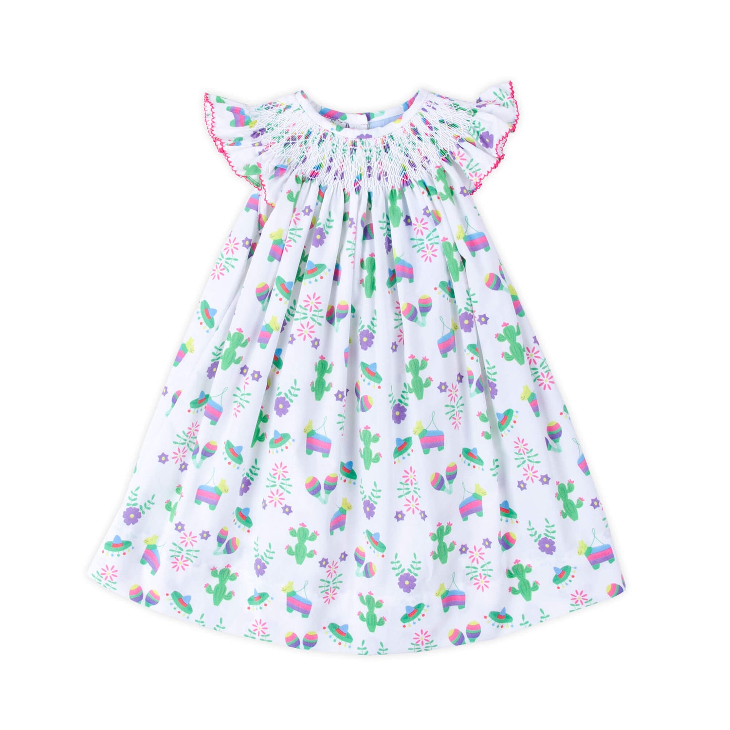 Get ready to fiesta in our vibrant Fiesta Time Print Smocked Angel Sleeve Dress, perfect for celebrating Cinco de Mayo! This playful dress bursts with a festive print featuring piñatas, cactuses, flowers, and sombreros, bringing all the fun of the celebration to life. The angel flutter sleeves with hot pink picot trim add a lively touch, making it the perfect outfit for Cinco de Mayo festivities and beyond!