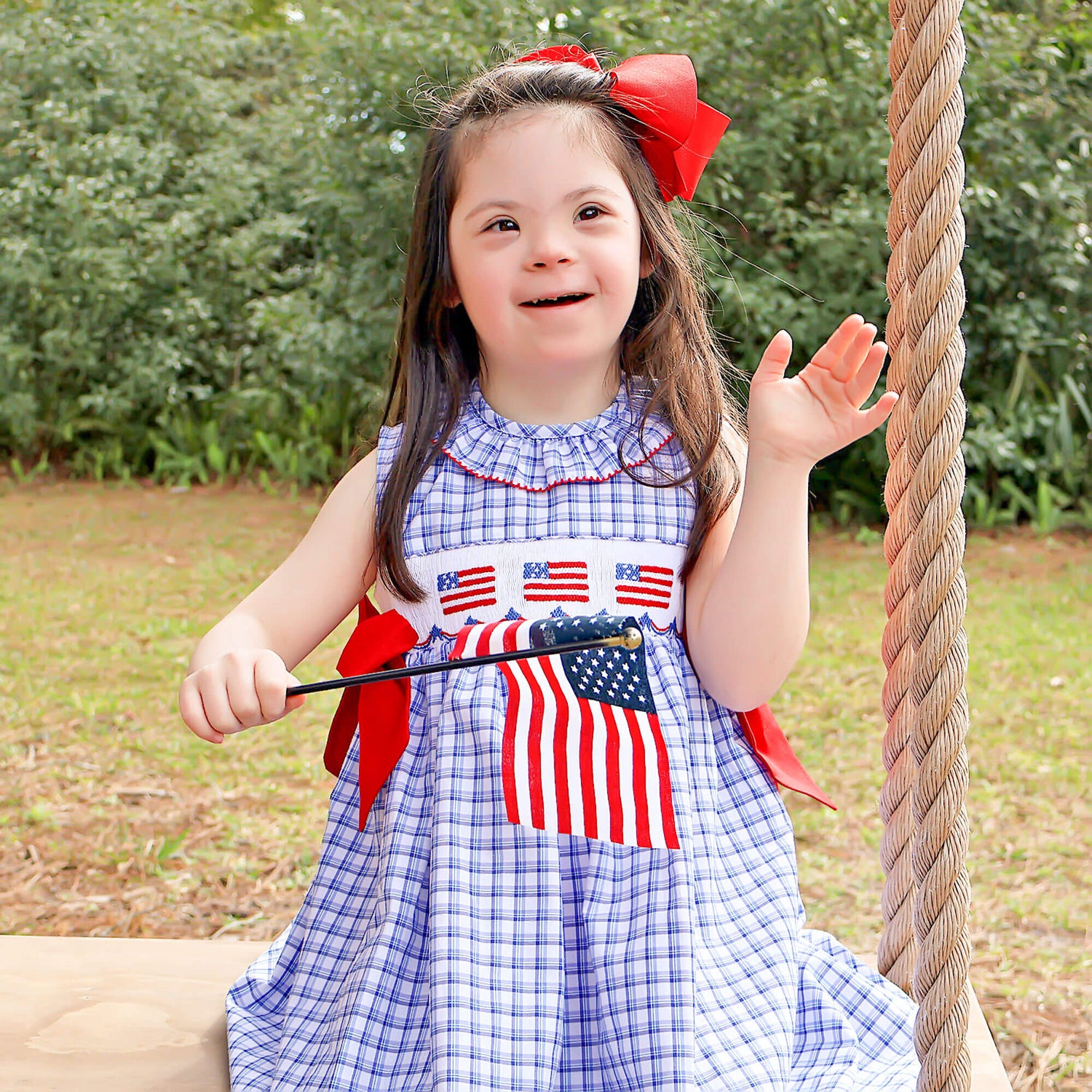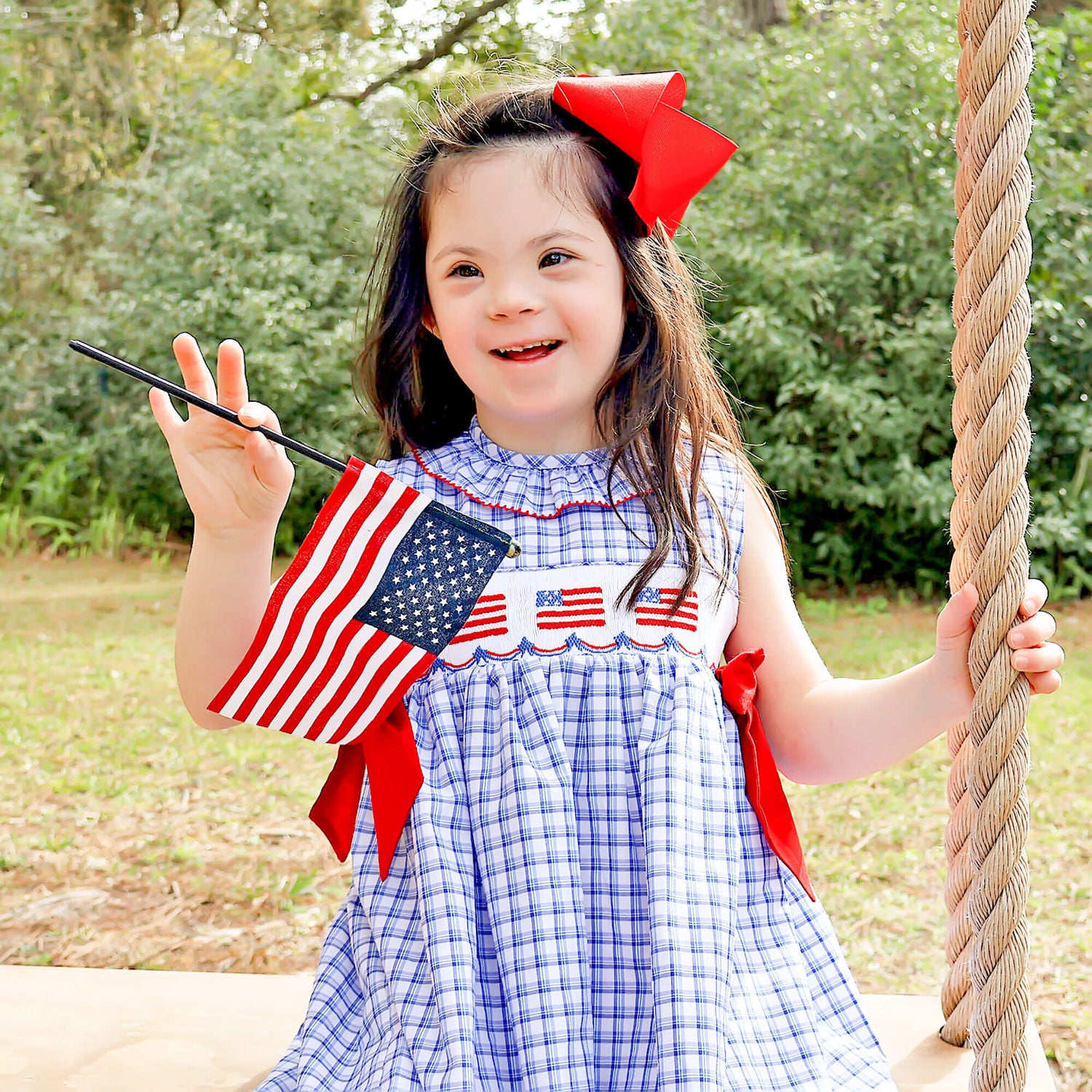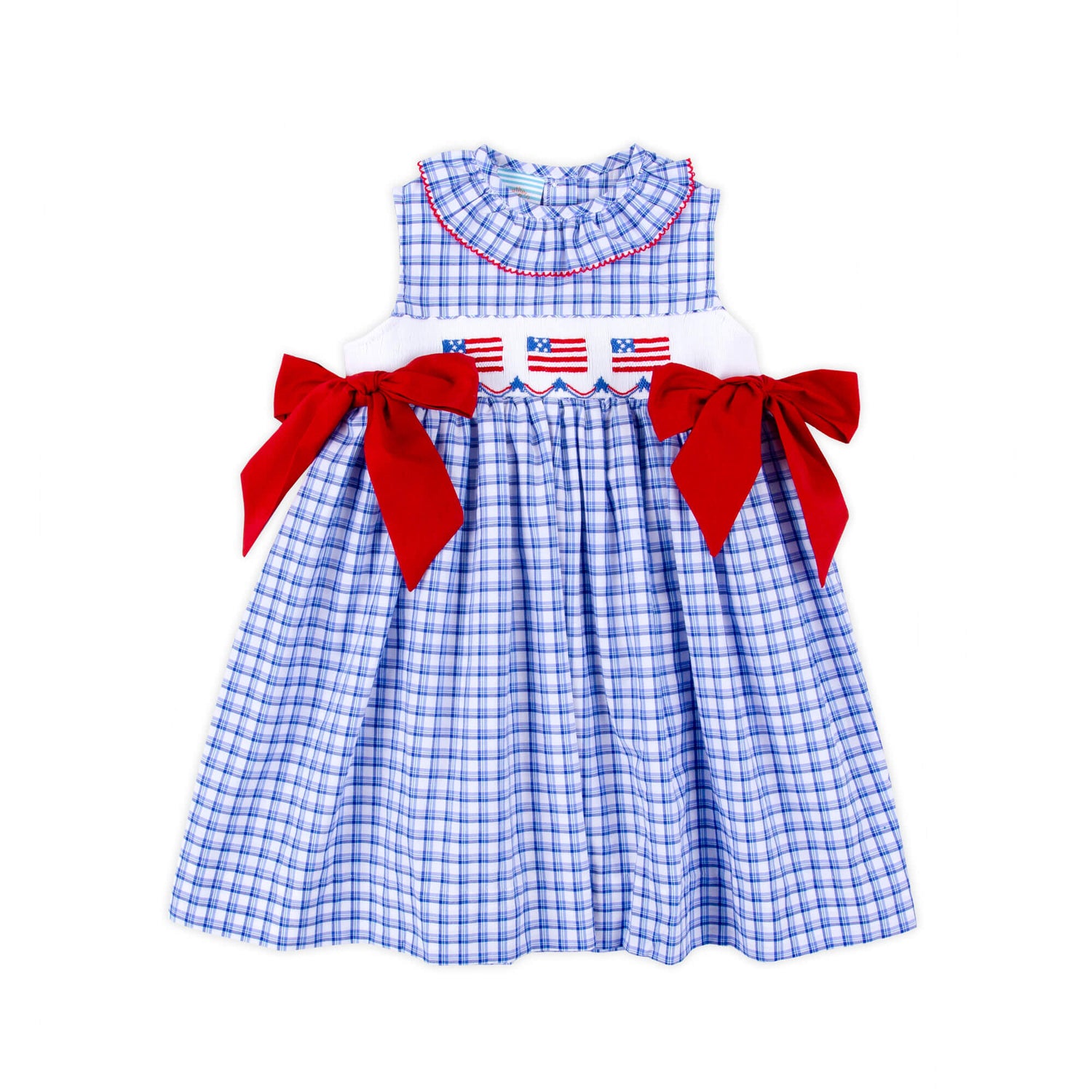 This Flag Smocked Blue Plaid Beverly Dress is the perfect patriotic outfit for 4th of July celebrations! This Beverly-style dress in a delightful blue plaid features smocked flags, a ruffle collar, and charming red side tie bows for an extra festive touch.
