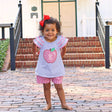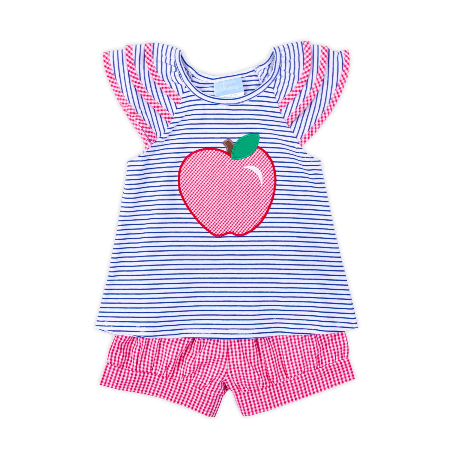 Have a fabulous first day of school in our Good Apple Royal Stripe Milly Short Set! This Milly-style top features royal soft knit stripes, ruffle sleeves with red gingham tape trim, and a large red gingham apple appliqué at the center. The set is coordinated with red gingham shorts for a classic school-day look. Add a monogram to the apple for a personalized touch!