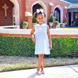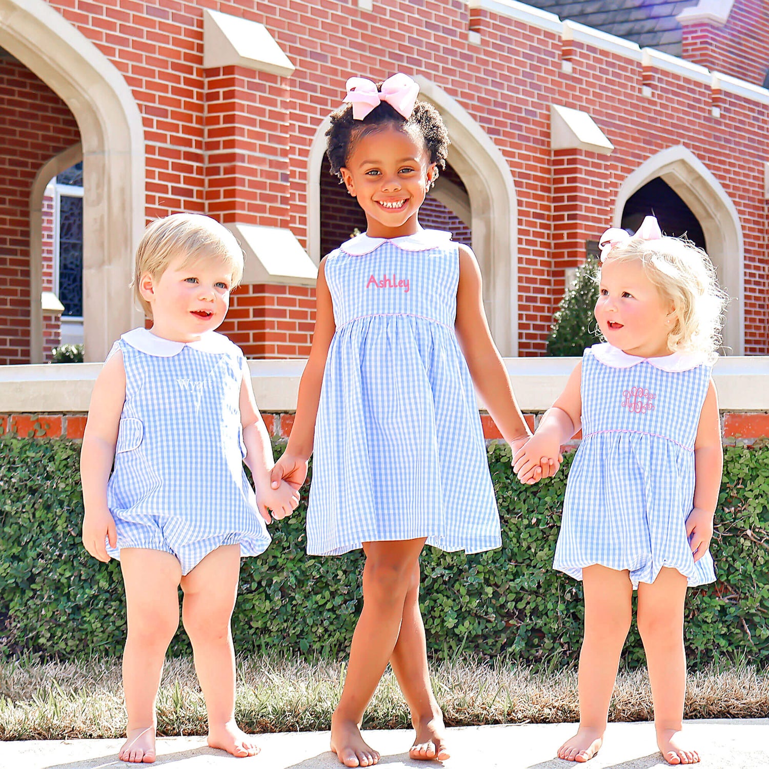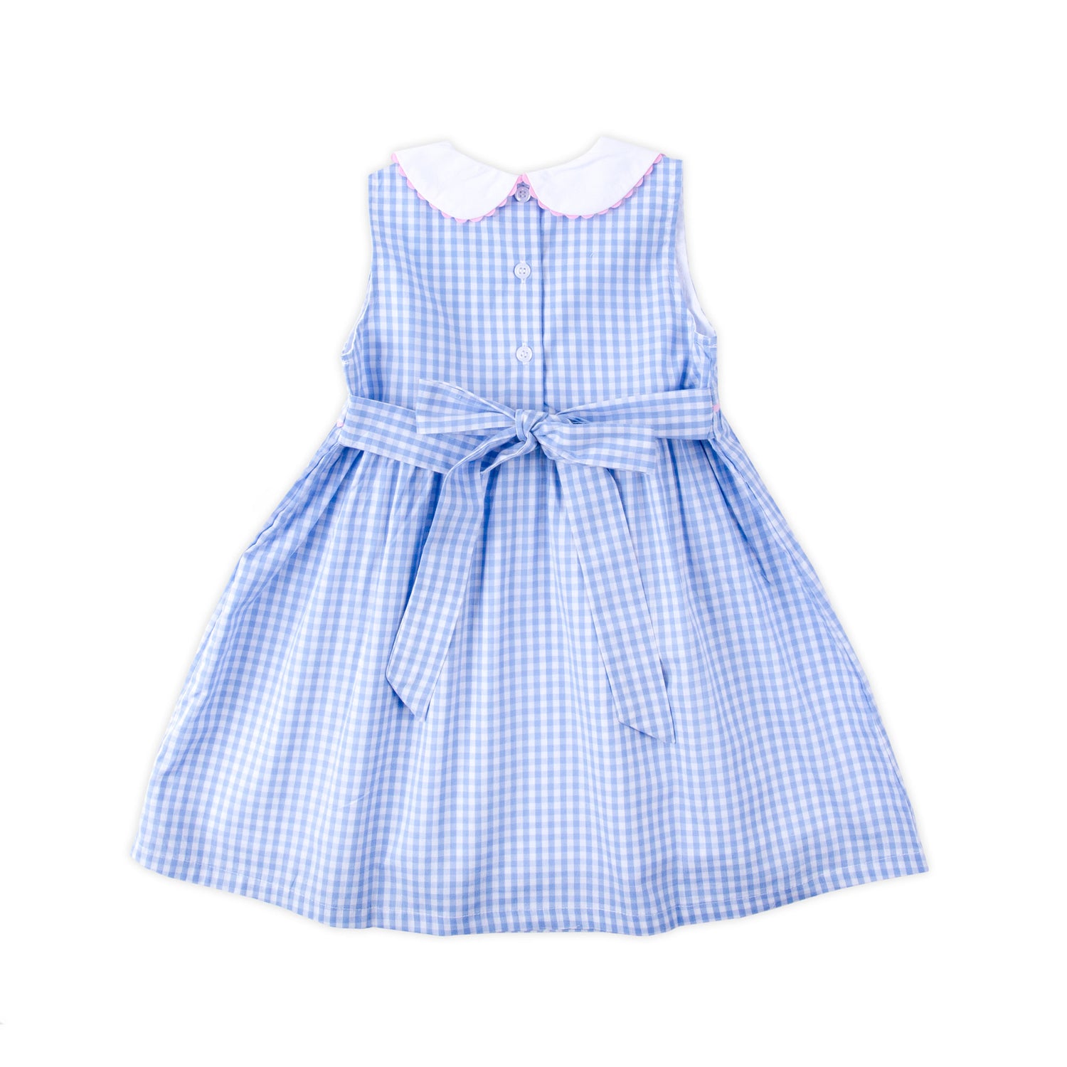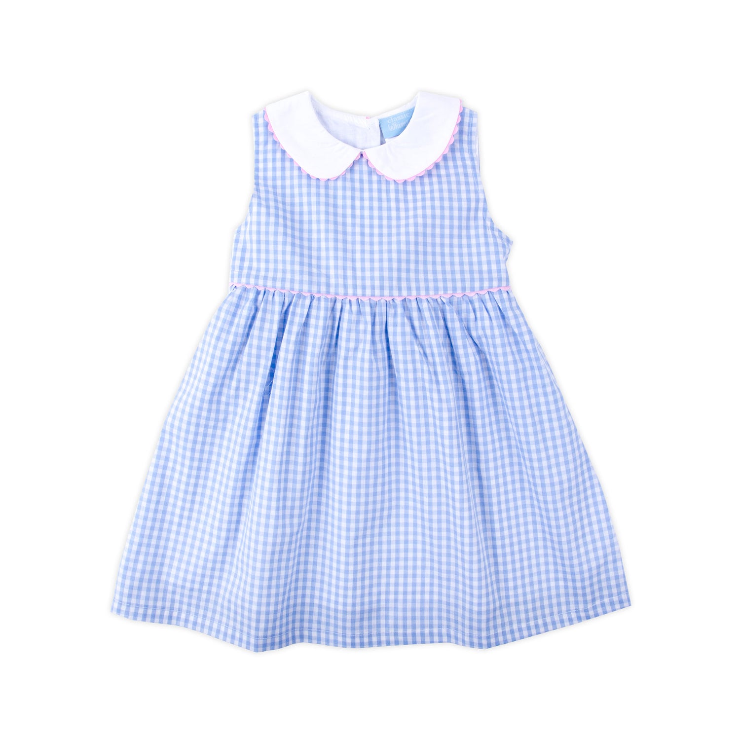 This Light Blue Gingham Heidi Dress is a stylish and comfortable choice for any sunny day. The sleeveless design features a light blue gingham fabric and a solid white collar accented with pink ric-rac trim. Add a monogram for a personalized touch!