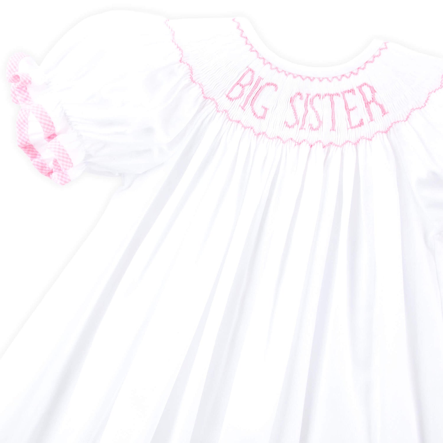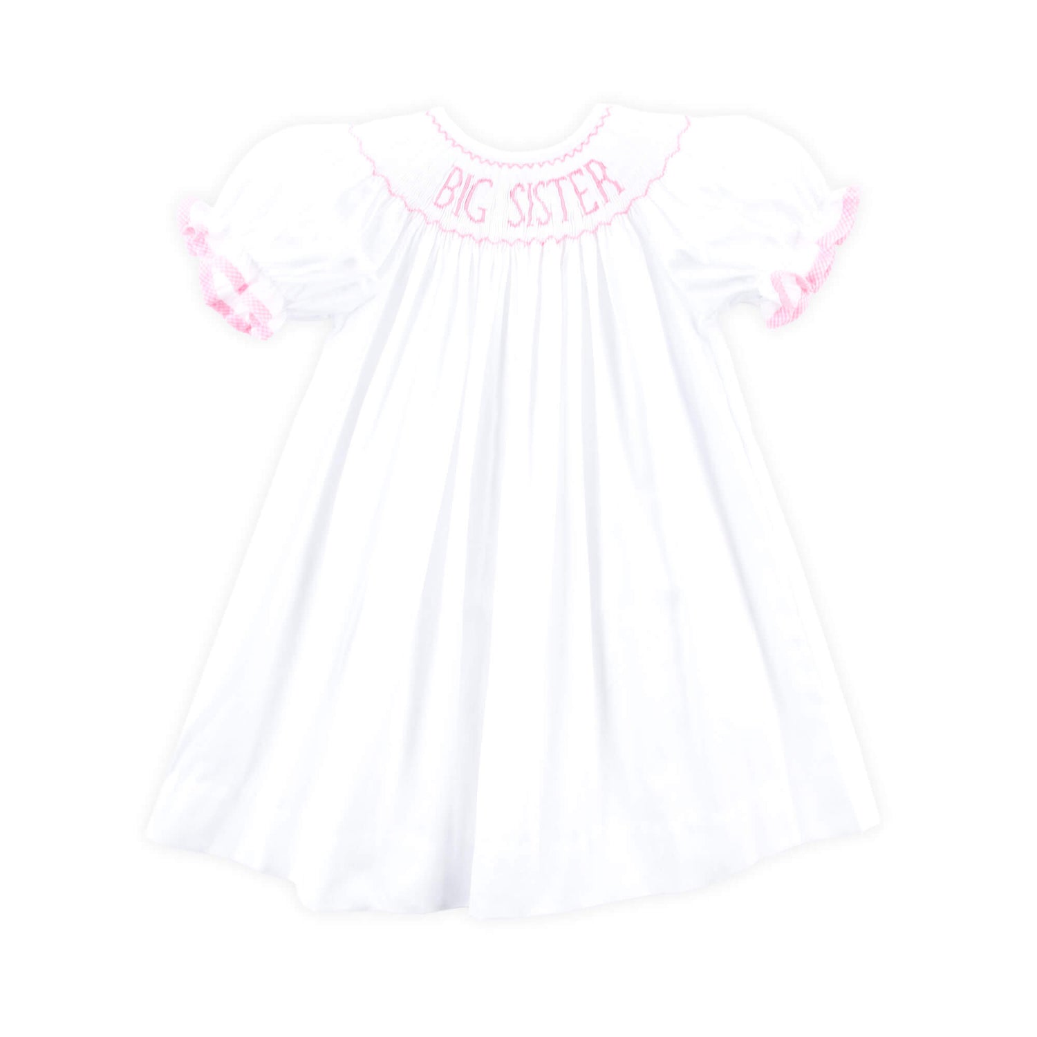 Solid white pique dress featuring "Big Sister" in pink smocking and bishop sleeves with pink trim. Perfect for baby announcements and newborn sibling photo ops!