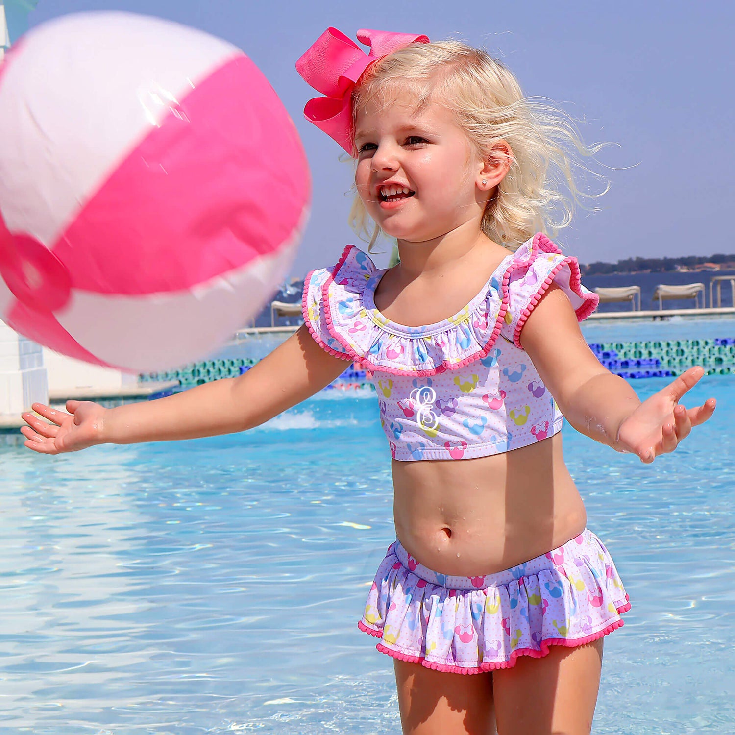 Get ready for a family vacation or poolside fun with our Pastel Mouse Ears Print With Pom Pom Two Piece Swimsuit. The swim top features an iconic pastel mouse ear print and a charming ruffle collar accented with pink pom-pom trim. Coordinated with matching swim bottoms, this set combines style and comfort. Plus, the swimsuit provides UPF 50 protection to keep your little one safe under the sun. Add a monogram to make it uniquely hers and extra special!
