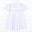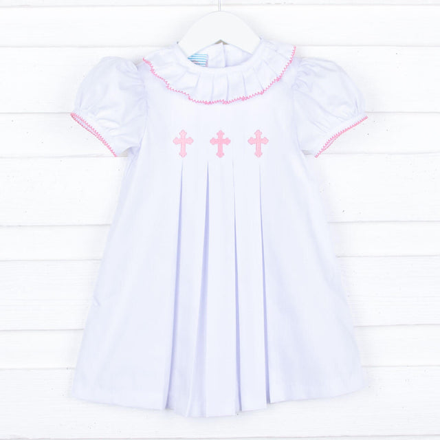 Make sure your little angel is stunning on her Christening Day, Easter or any special event at church! This pleated dress features embroidered pink crosses on a solid white pique fabric. Also features a cute ruffle collar and puff sleeves with a pink picot trim. Buttons in the back.