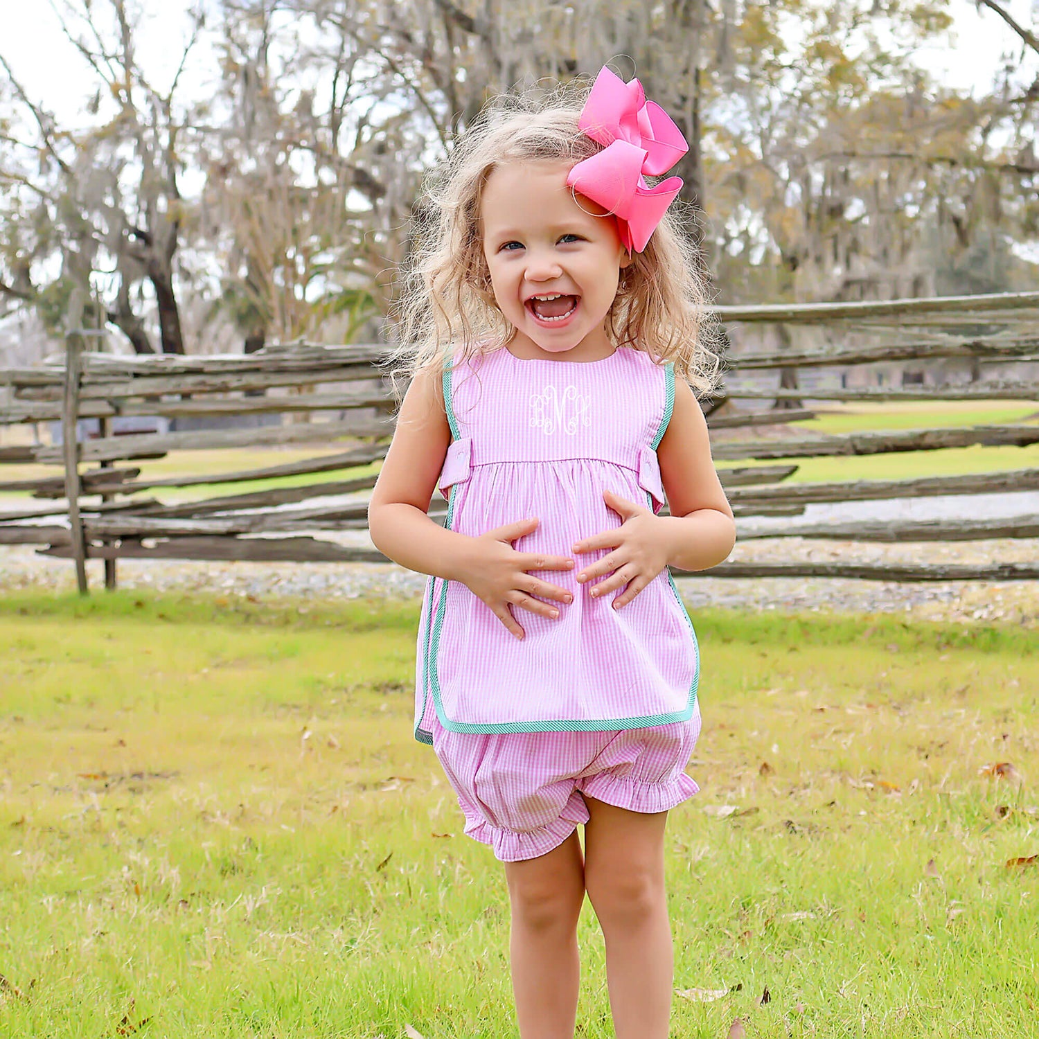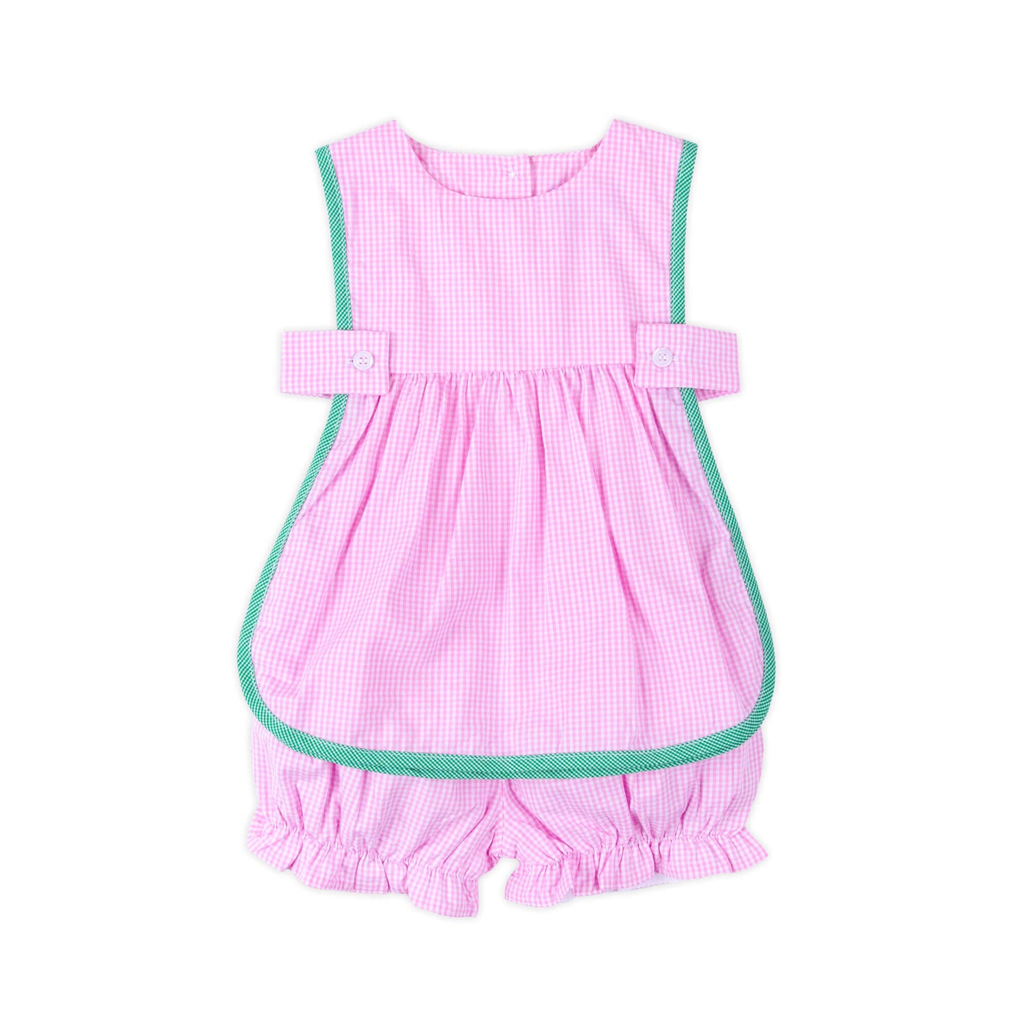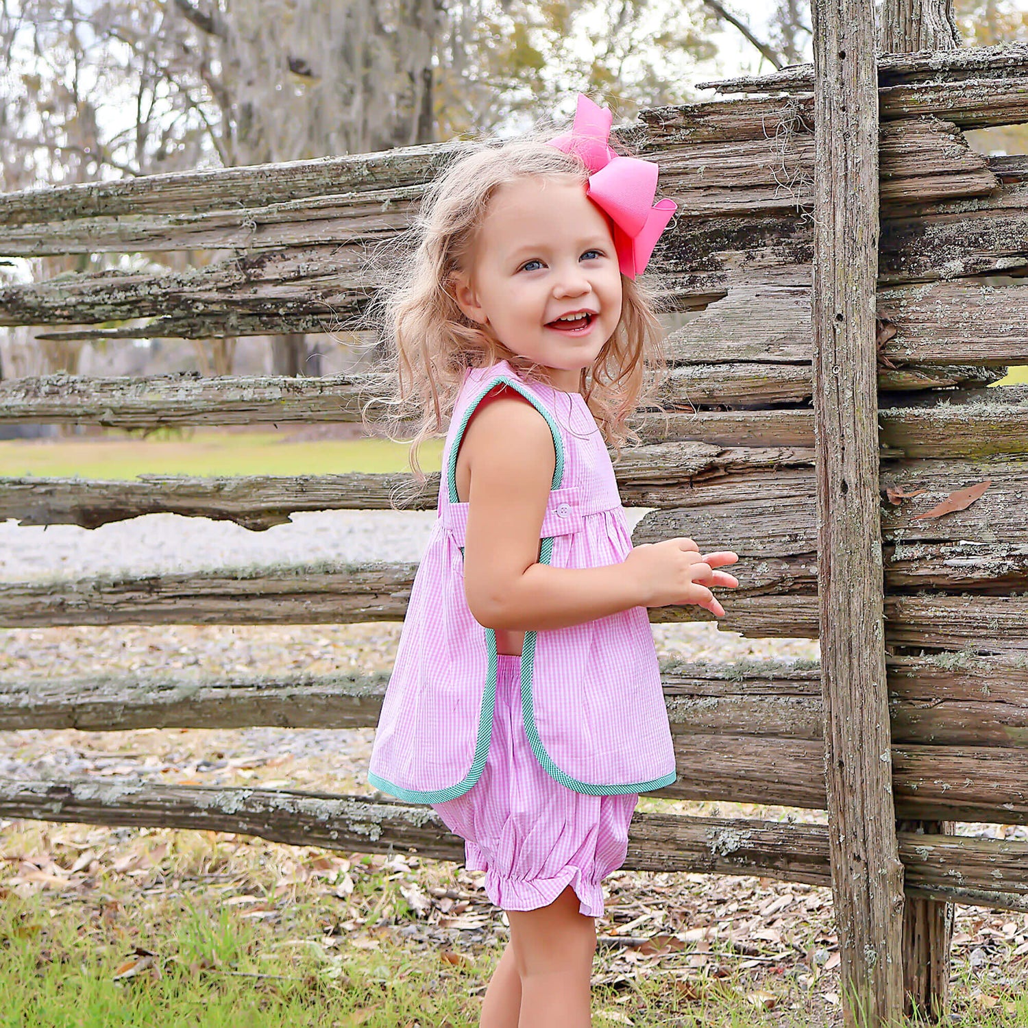 Get ready to celebrate the vibrant spirit of summer with our delightful Pink Gingham Lucia Bloomer Set! The pink gingham Lucia-style top, accented with green gingham trim, is perfect for sunny days. Coordinated with matching pink gingham bloomers, this set is both charming and comfortable. Add a monogram for a personalized touch!