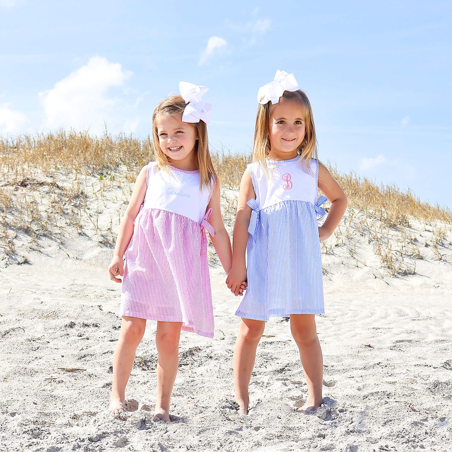 The Pink Stripe Seersucker Side Tie Dress is a delightful and playful choice! This sleeveless dress features charming pink stripe seersucker fabric, sweet side ties, and delicate pink picot trim, perfect for spring and summer outings. Make it even sweeter by adding a monogram for a personalized touch!