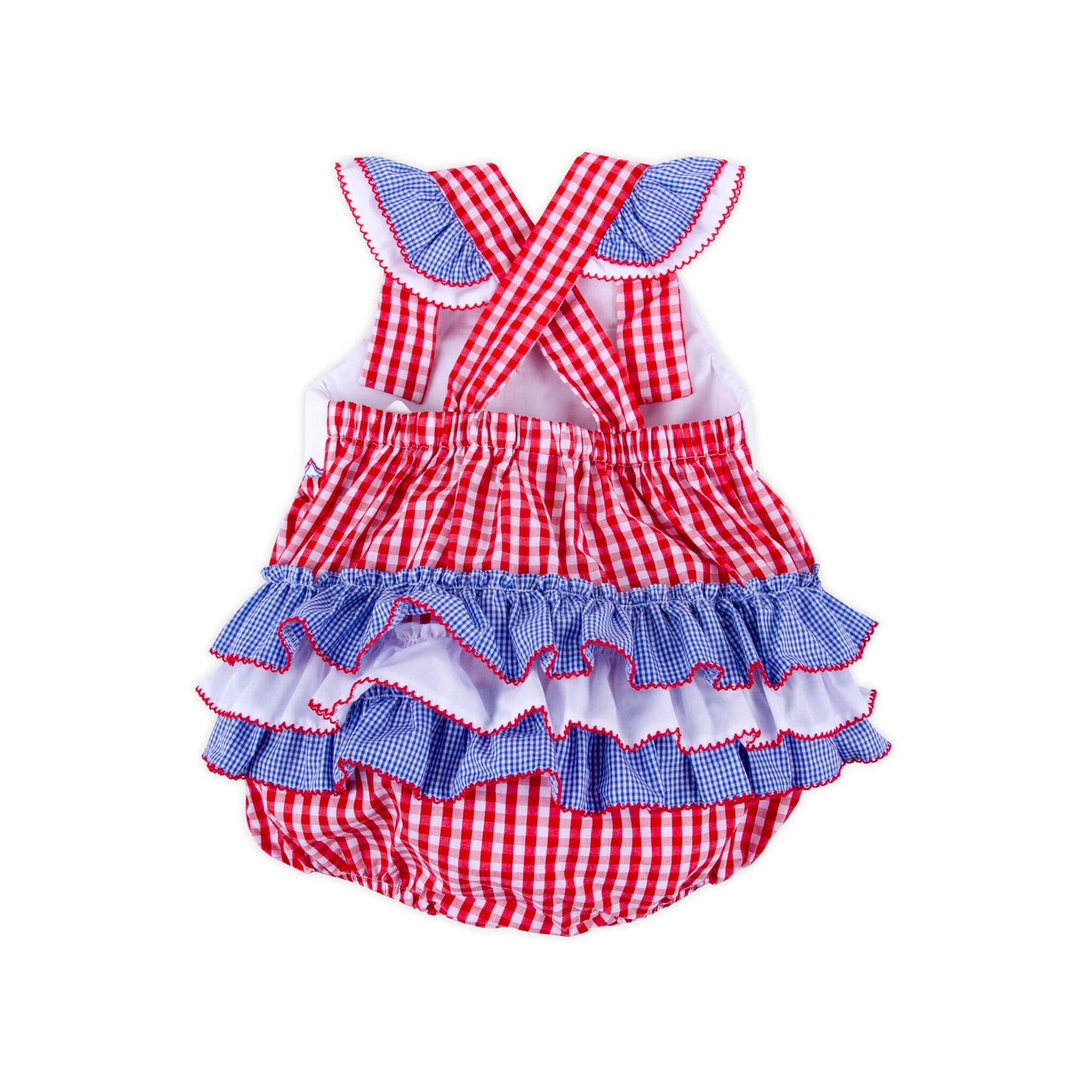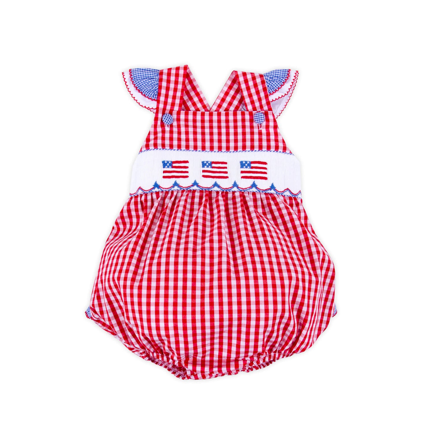 We love celebrating the 4th of July! Add the Red Check American Flag Smocked Leah Bubble to your festivities. This red gingham bubble features smocked flags and ruffles on the back. Snaps in the stride make for easy changes, perfect for all the holiday fun!