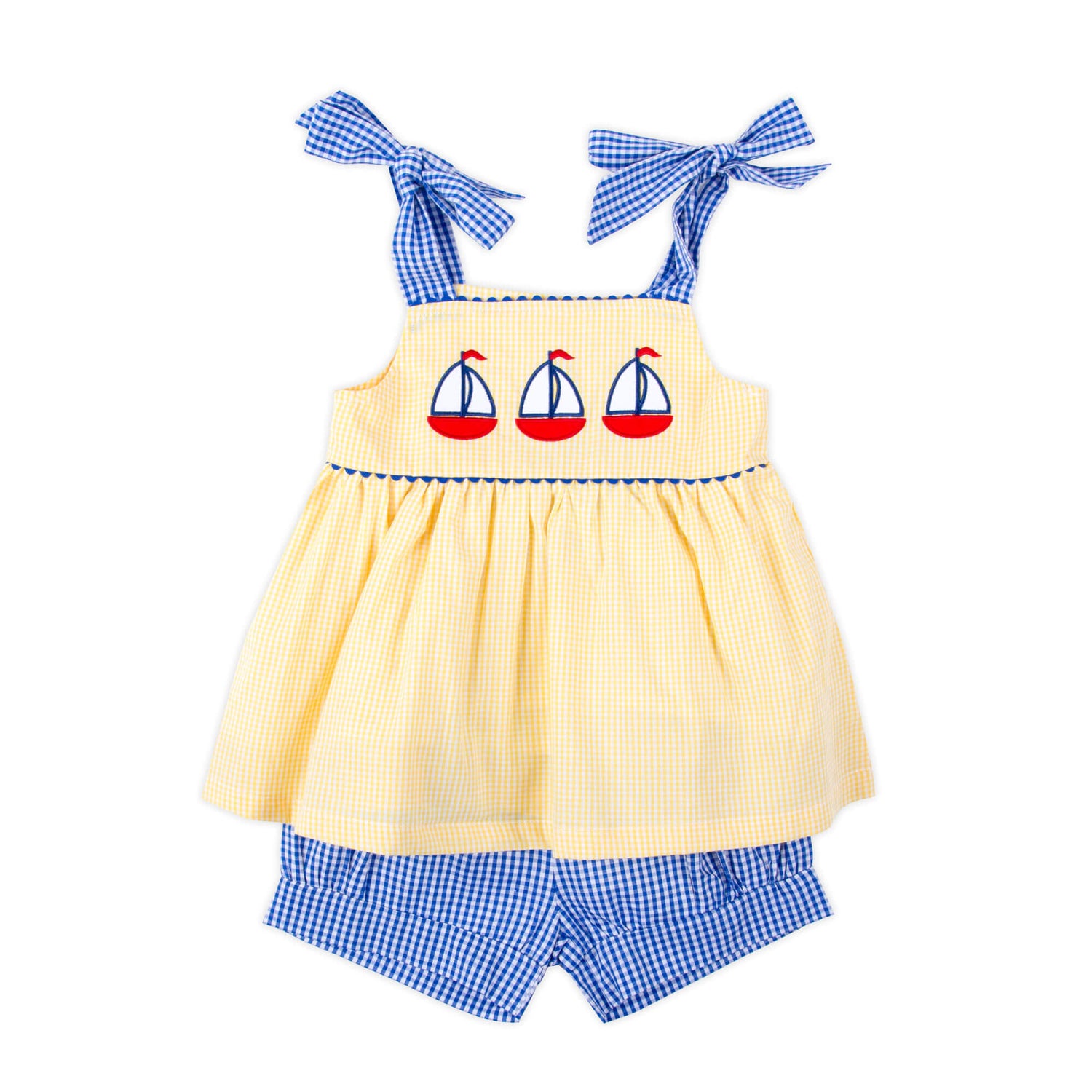 Your little one will be ready to sail into summer style in the Newport Sailboat Yellow Gingham Aubree Short Set! This cheerful yellow gingham top features three adorable sailboat appliqués, playful blue ric-rac details, and sweet blue gingham tie straps. The set is coordinated with blue gingham shorts, making it perfect for sunny days and seaside adventures!