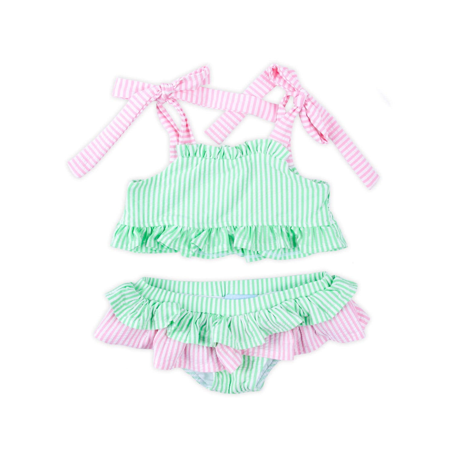 Prepare for your upcoming water adventure with this Santorini Green and Pink Stripe Two Piece Swimsuit. Offering UPF 50 sun protection, the seersucker stripe top is finished with tie straps. The set is completed with matching ruffle swim bottoms for a stylish and coordinated look. Personalize it with a monogram for a special touch that makes it uniquely theirs.