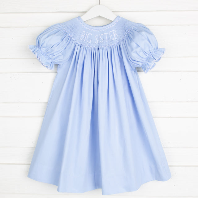 Your little one will love celebrating her new status in this Smocked Big Sister Bishop Dress in Light Blue. This solid light blue pique dress features 'Big Sister' in white smocking, with charming bishop sleeves accented by white trim. Perfect for baby announcements and sibling photo ops!