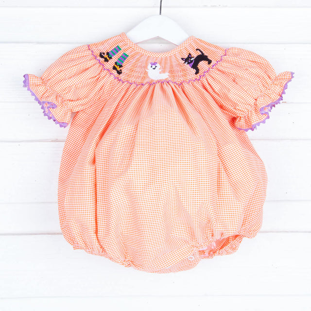 Get into the spooky spirit with our Smocked Halloween Orange Gingham Bubble! This playful outfit features adorable bishop sleeves and festive purple ric-rac, with a hand-smocked design showcasing a friendly ghost, whimsical witch legs, and a mischievous black cat. Snaps in the stride make dressing up for Halloween a treat!