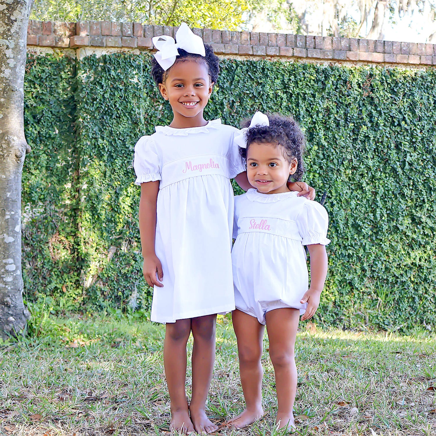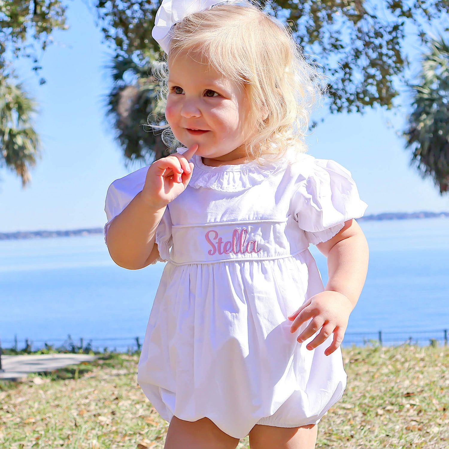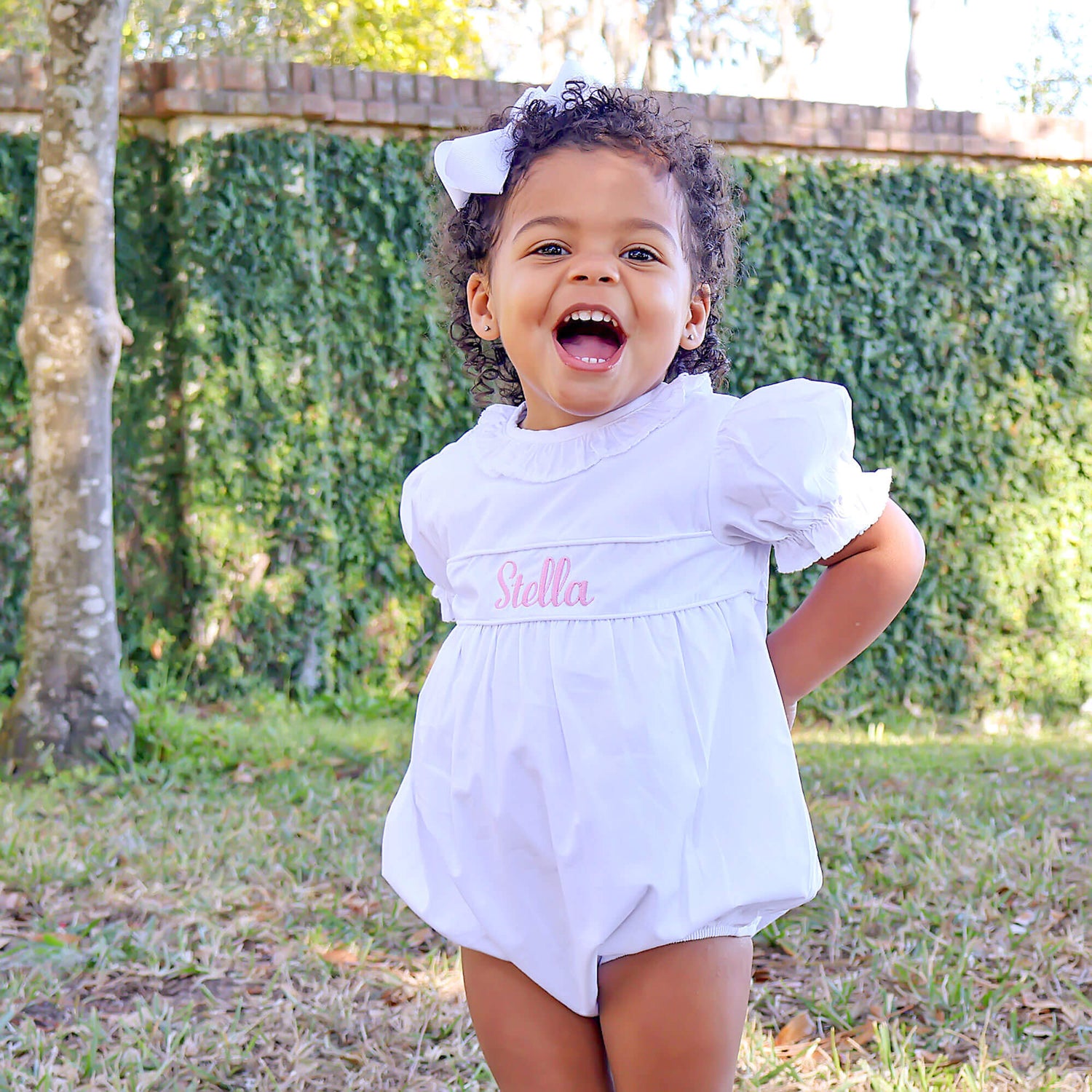 Elevate your little one's spring and summer wardrobe with our enchanting Solid White Ruffle Collared Bubble. This delightful solid white bubble is perfect for special occasions while adding a touch of charm to everyday moments. Made from solid white fabric, it features a ruffle collar and bishop sleeves that create a whimsical and stylish look. Snaps in stride for easy changes. Add a monogram for a personalized touch to make this dress truly unique.
