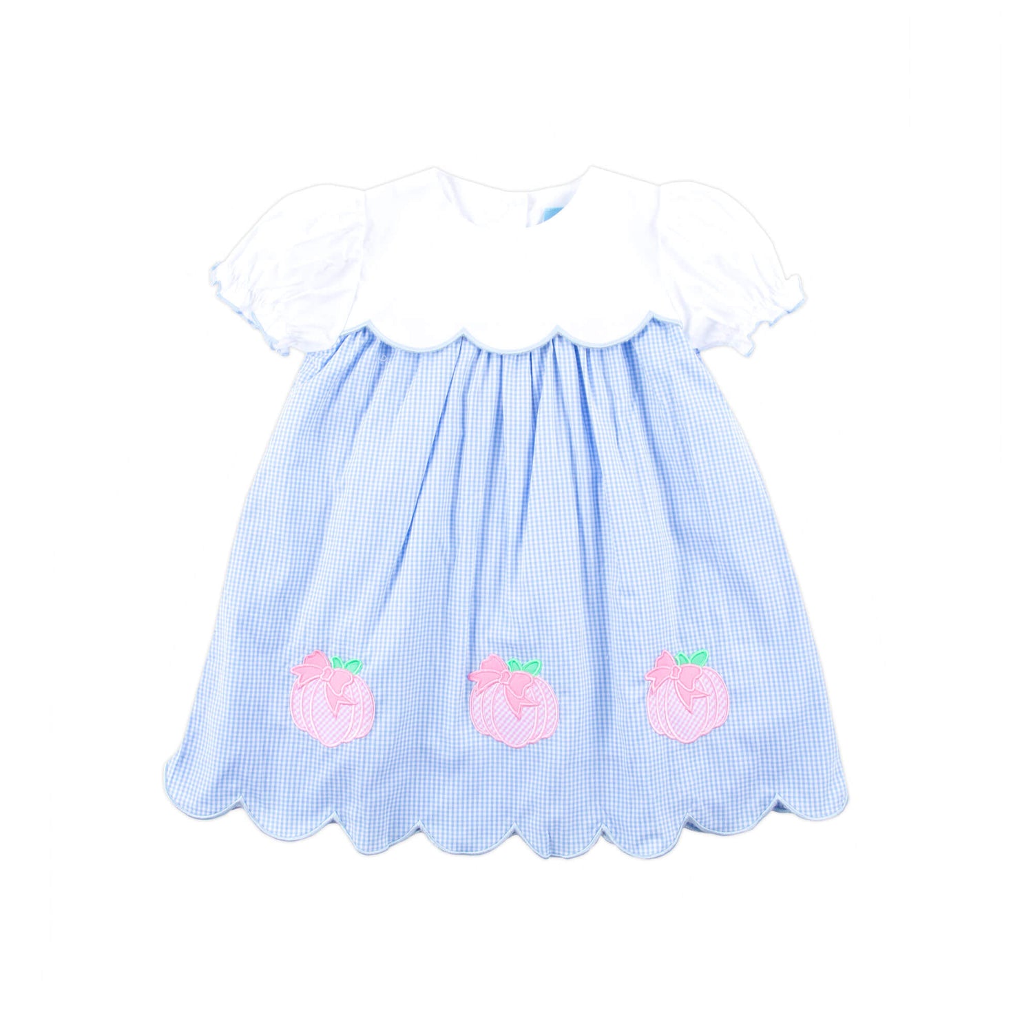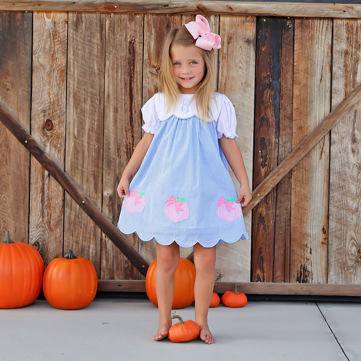 Your sweetie will love pumpkin patch adventures in the Sweet Pumpkin Bow Light Blue Gingham Amelia Dress! This light blue gingham dress features adorable pumpkin appliqués and a scalloped hem. Add a monogram for a personalized touch!