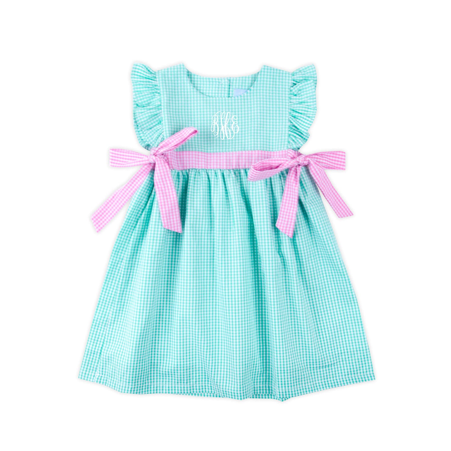 The Turquoise Gingham Avery Dress is a delightful and playful choice! Featuring turquoise gingham fabric, flutter sleeves, and pink gingham side ties, it's perfect for spring and summer. Add a monogram for a personalized touch and make it even sweeter!