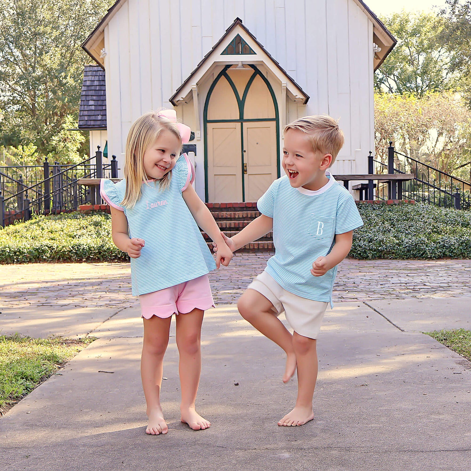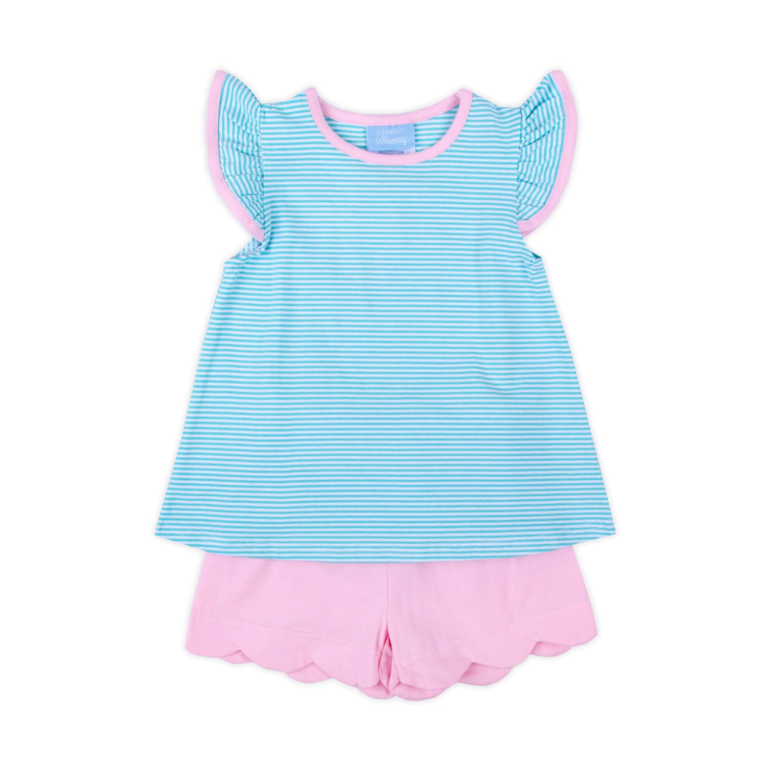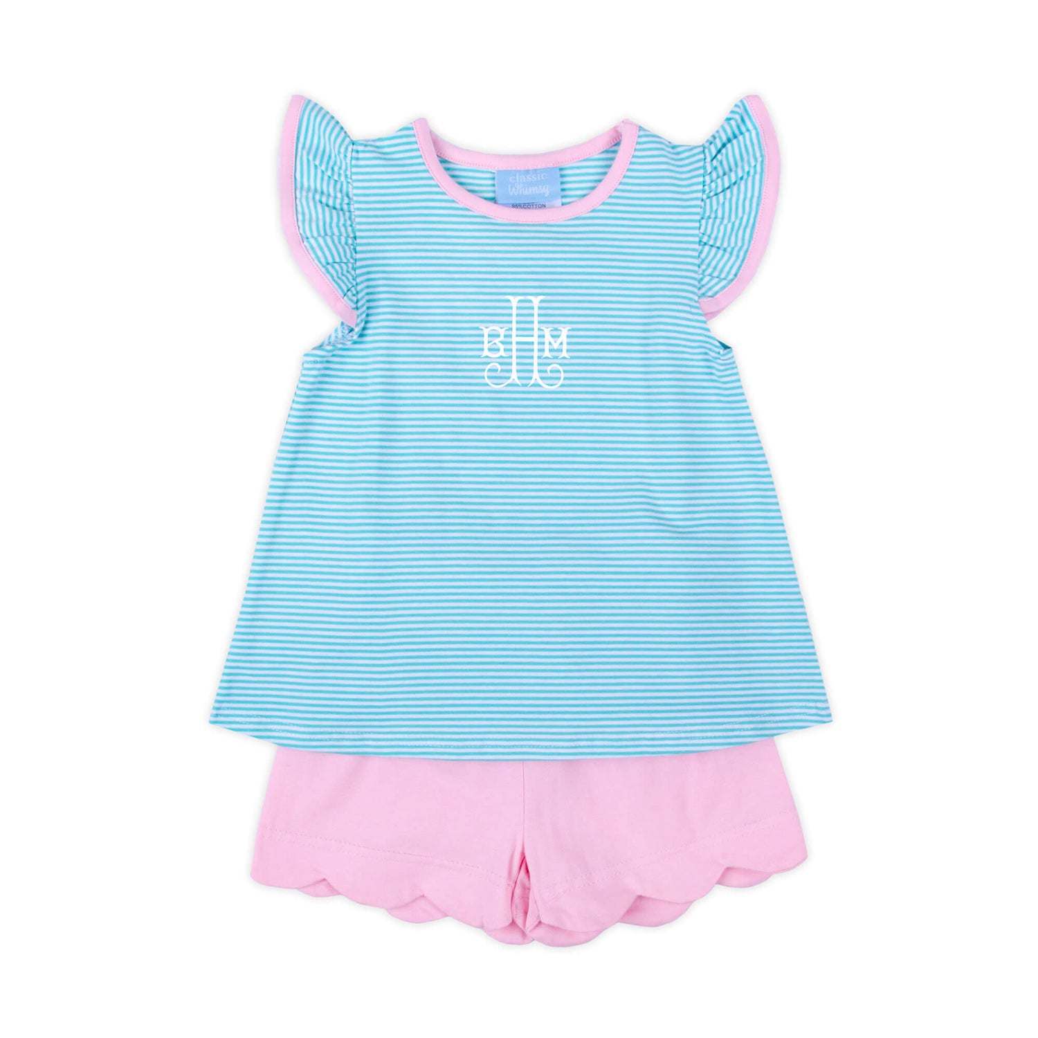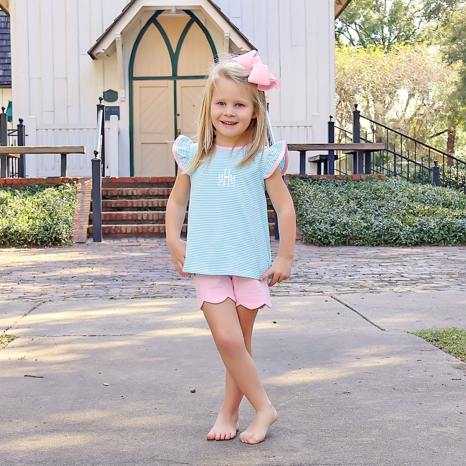 Your little girl will love twirling through spring and summer in the Turquoise Stripe Liv Short Set! This playful Live-style top, designed in a cheerful striped knit, features adorable flutter sleeves trimmed with pink tape for a pop of fun. The set is coordinated with pink shorts. Add a monogram to make it uniquely hers! It’s the perfect outfit for creating sweet memories and exploring sunny days!