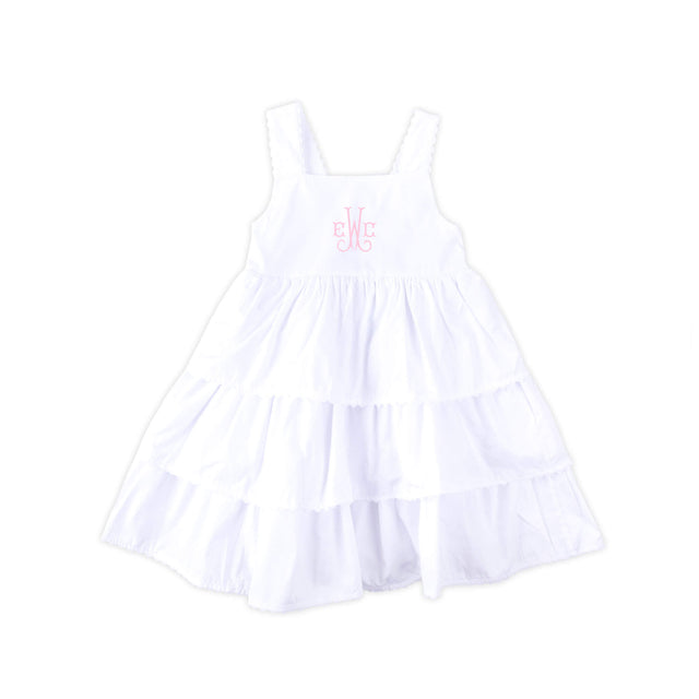 This White Nova Dress is bursting with charm and perfect for sunny adventures! This solid white Nova-style dress features a ruffle-tiered design accented with playful white ric-rac trim and adorable cross-back straps. Add a monogram to make it uniquely hers and even more special!