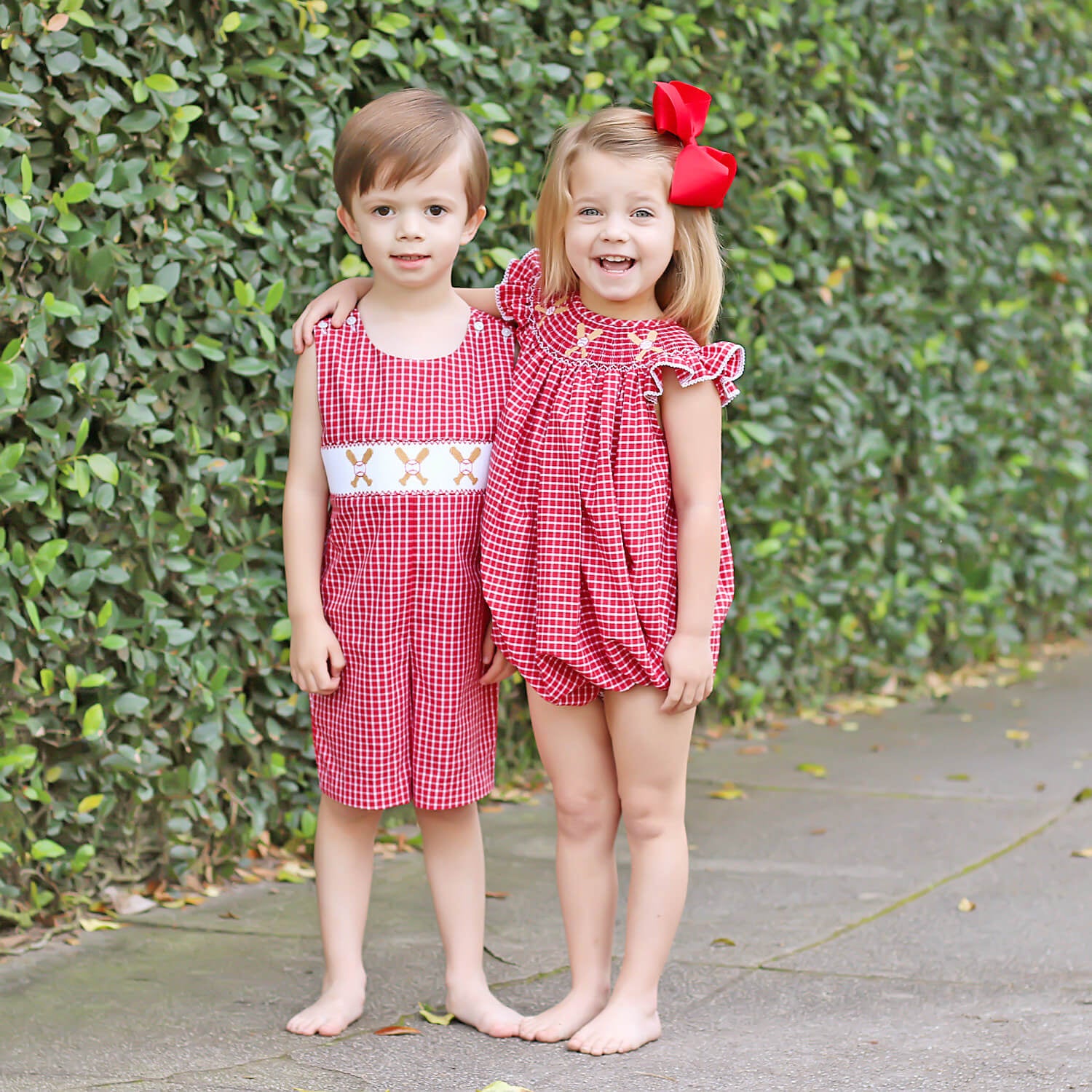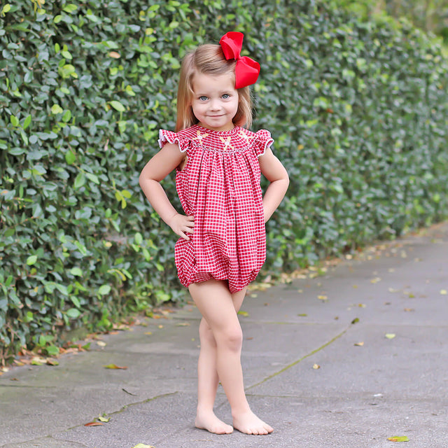 Prepare for baseball season in style with our Baseball Smocked Red Plaid Bubble. This charming red gingham plaid bubble features smocked bats and baseballs, creating a playful and sporty look. The flutter sleeves, adorned with white picot trim, add a touch of sweetness to the outfit. For added convenience, the bubble features snaps in the stride for easy dressing.