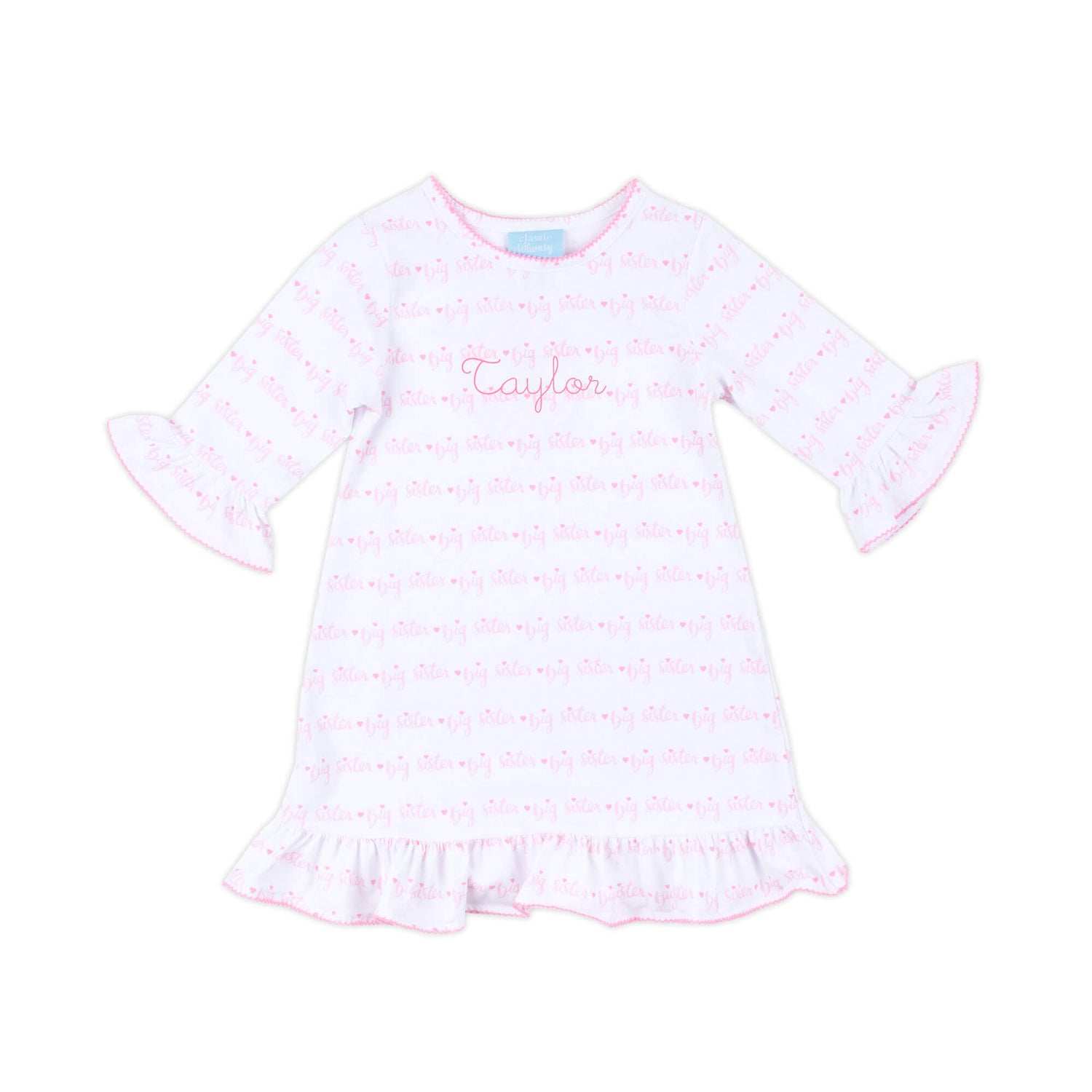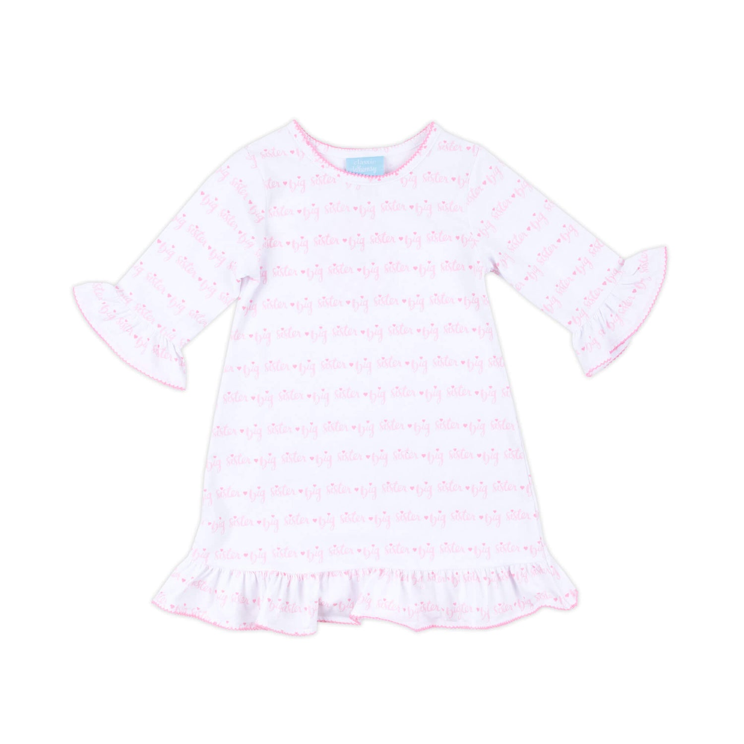 Your big girl will love showing off her new title in this Big Sister Long Sleeve Milly Dress! Made from soft knit, it features a pink "Big Sister" print and cute ruffle sleeves with pink trim, perfect for celebrating her special role in style.