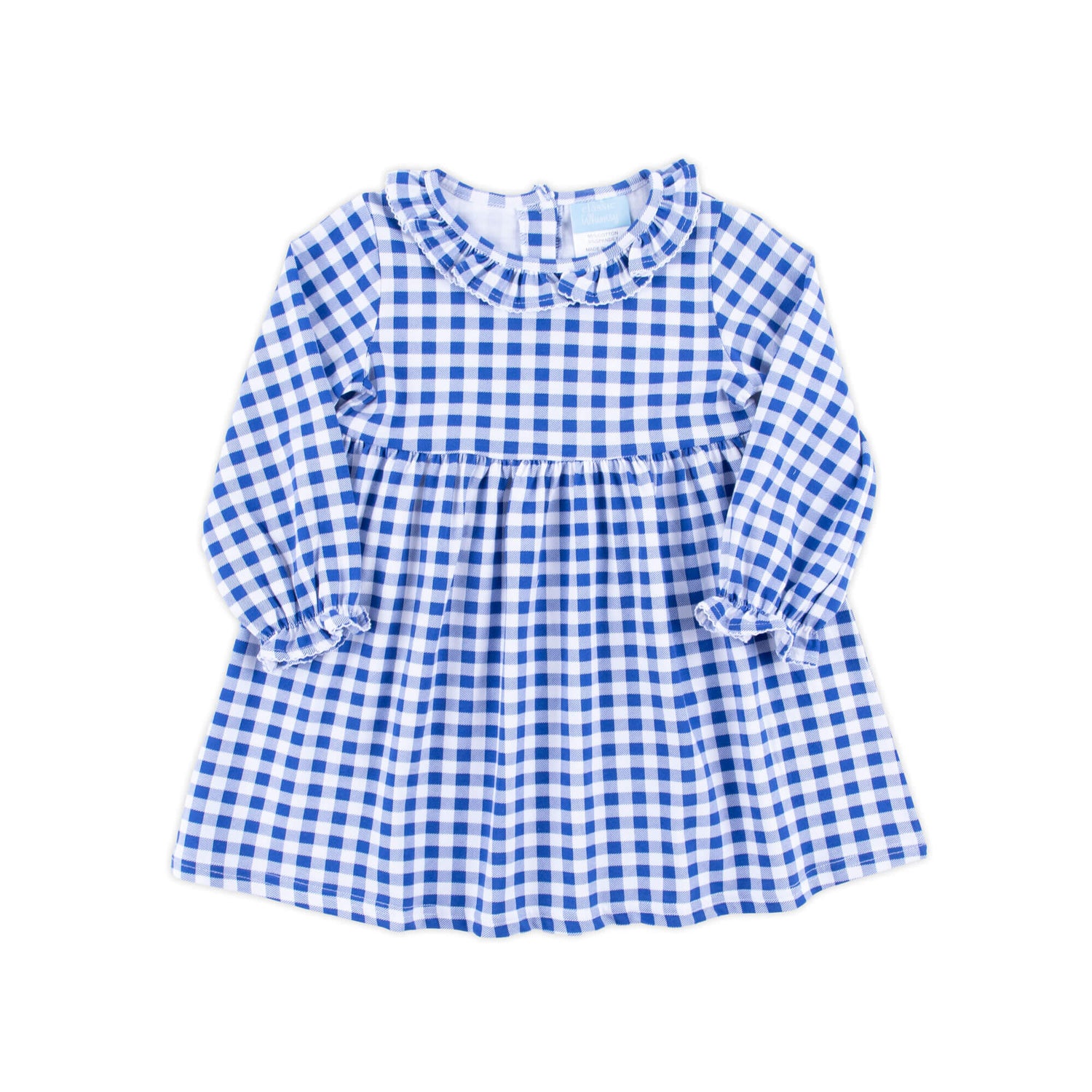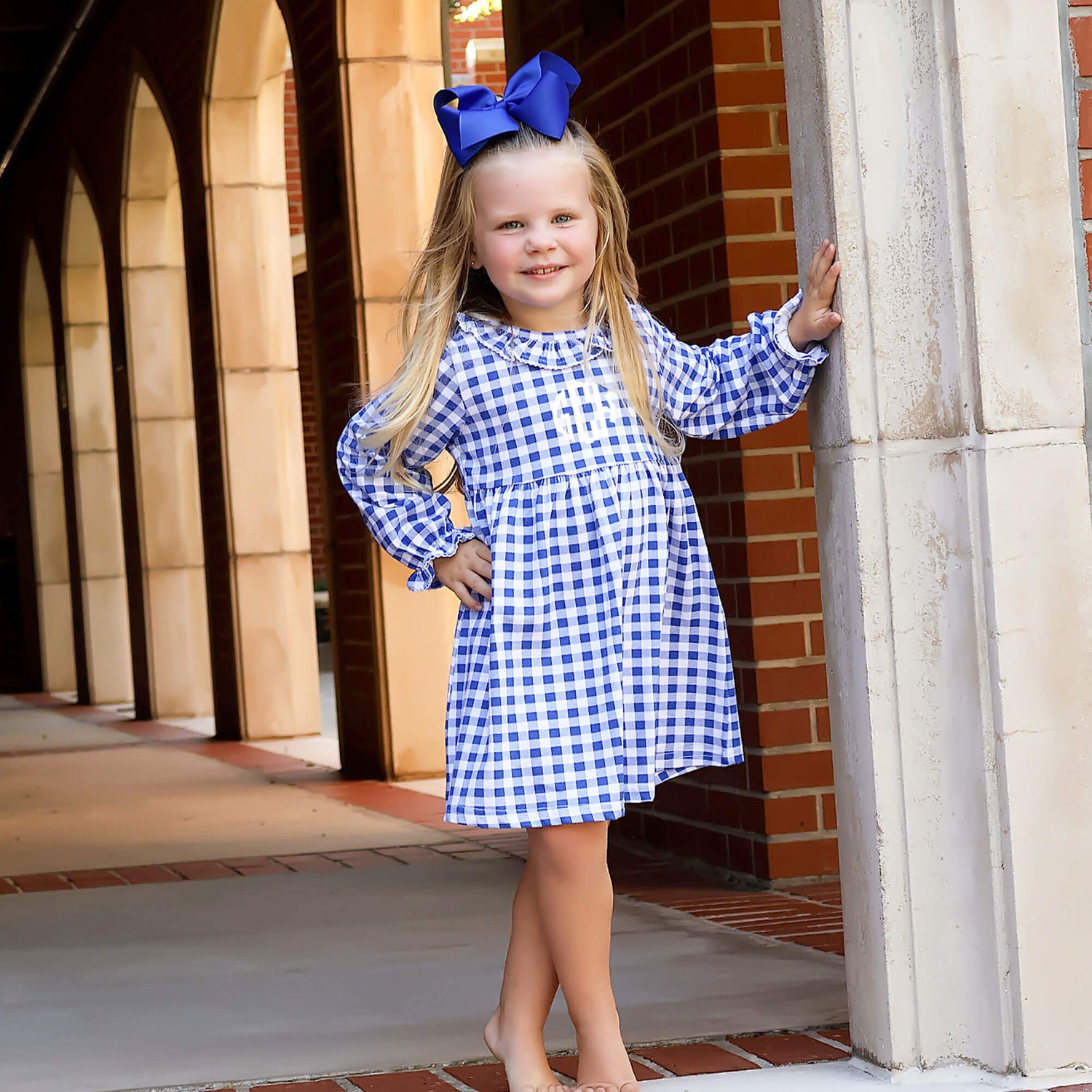 Add a sweet pop of color this fall with our adorable Blue Check Eden Dress! This charming royal blue check knit dress features playful long bishop sleeves and a darling ruffle collar, making it the perfect choice for a fun and stylish day out. Plus, you can add a personalized monogram to make it uniquely yours