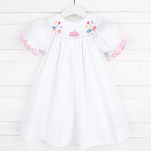 It's time to party with the cutest birthday celebration in our party dress! Smocked birthday cake, presents and balloons. Features light pink gingham tape trim is the most adorable addition.